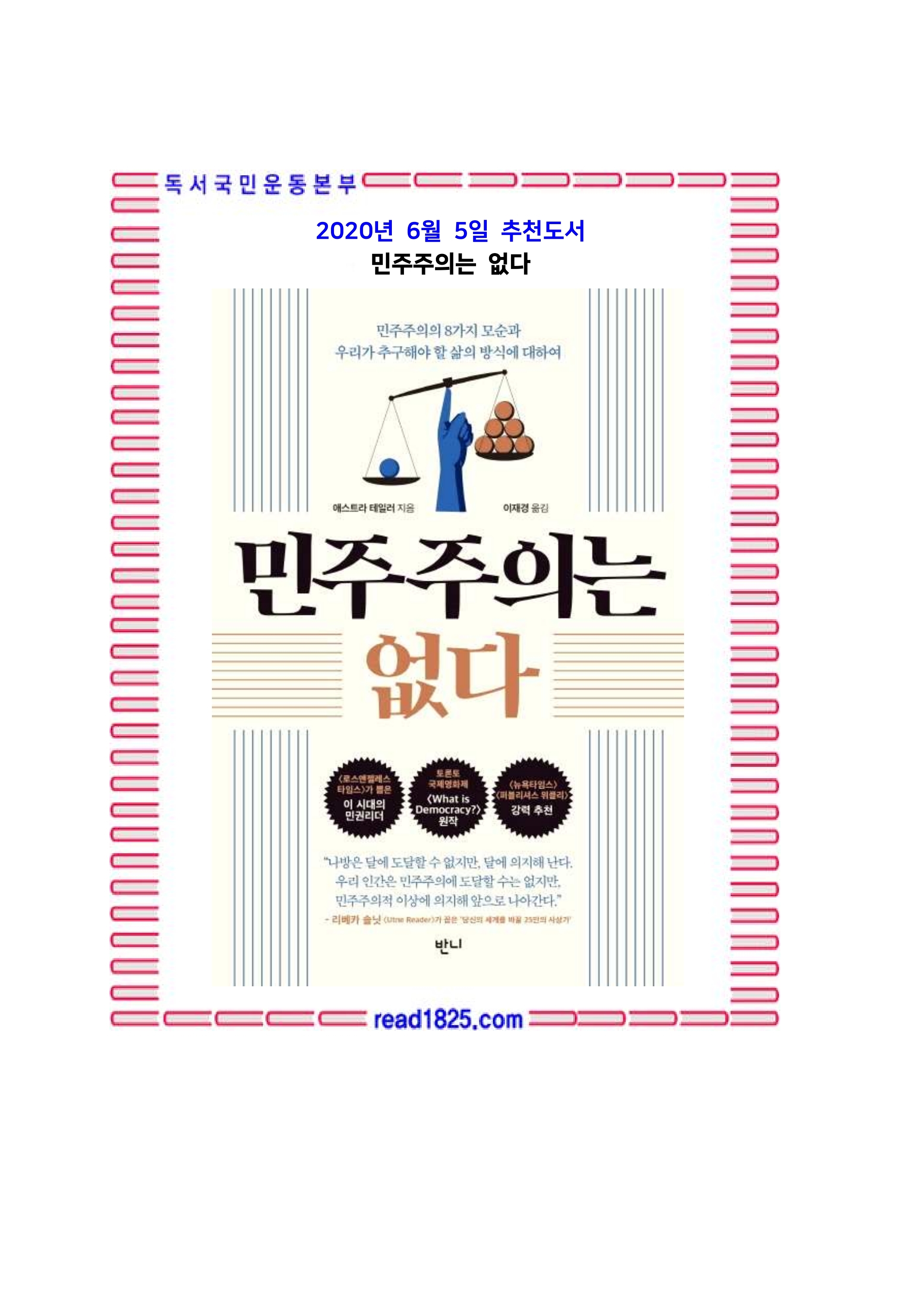 사실 완벽한 민주주의는 여태껏 없었으며, 앞으로도 없을지 모른다. 그렇다고 우리가 민주주의를 포기해야 하는 것은 아니다. 외려 우리 모두가 민주주의를 끊임없이 의식하고 질문해야 한다. 민주주의는 이상이자 원칙이며, 항상 멀리 있고 자꾸만 뒤로 물러나는 지평선에 걸려 있는 것, 우리가 계속 팔을 뻗지만 잡히지 않는 것. 포기하지 말고 민주주의의 모순과 기회들을 수용해 우리 모두가 부단한 긴장 속에 살아가야 한다고 《민주주의는 없다》는 말한다.
