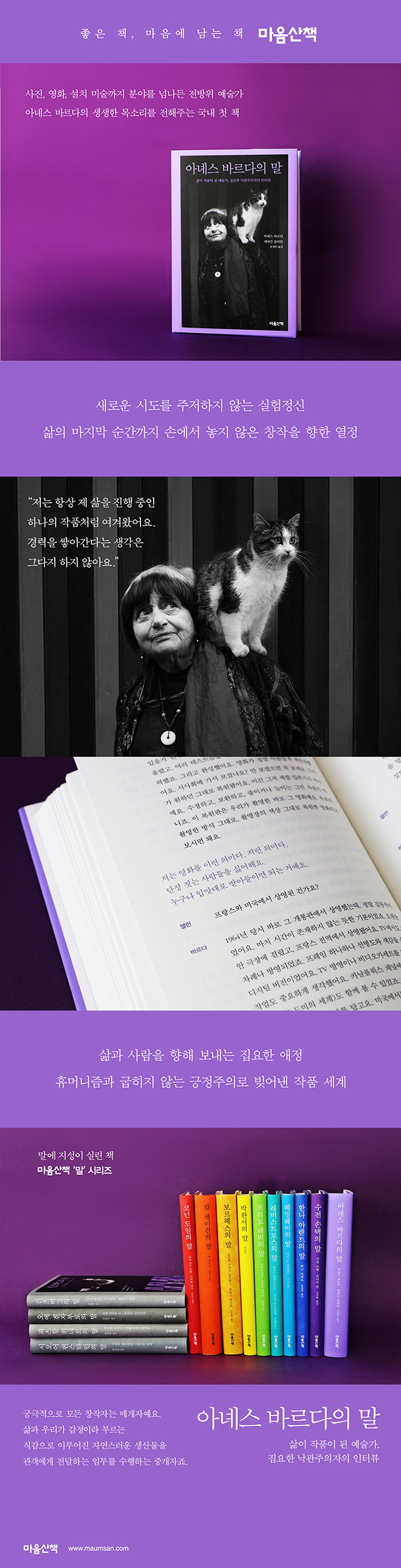 마음산책 열네 번째 ‘말 시리즈’의 주인공은 영화를 만드는 매 순간 “호랑이처럼 싸워야만” 했던 아녜스 바르다이다. 그는 누벨바그의 유일한 여성 감독으로 주체적인 여성으로서의 정체성과 우리가 살아가는 현실에서 발견하는 모순들을 끊임없이 조명해왔다. 처음으로 국내에 바르다를 소개하는 책 『아녜스 바르다의 말』에는 1962년부터 2017년까지 55년의 세월을 가로지르는 스무 편의 인터뷰가 담겼다. 연도순으로 각본가, 영화평론가, 배우 등 각기 다른 스무 명의 인터뷰어와 나누는 때론 유쾌하게 장난스럽고 때론 묵직하게 진솔한 대화들은 읽는 이를 웃고 울게 한다.