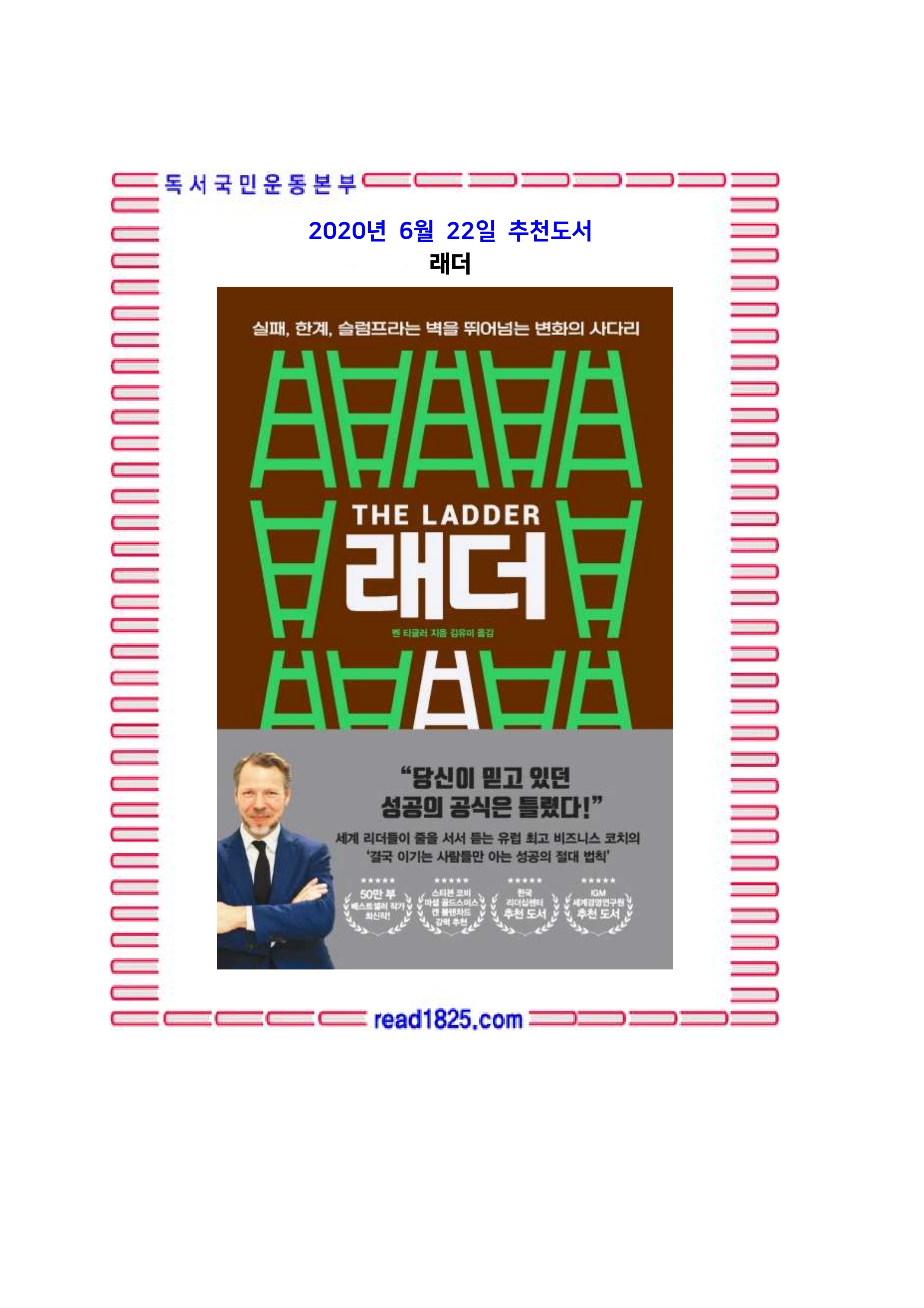 전 세계적으로 3000만 부가 팔리며 ‘성공학의 교과서’라고 불리는 《성공하는 사람들의 7가지 습관》 저자 스티븐 코비, 1회당 2억 5000만 원이라는 비싼 수업료로 유명한 리더십 코치 마셜 골드스미스, 세계에서 가장 영향력 있는 경영 컨설턴트 켄 블랜차드. 세계 최고의 성공학 대가이자 초대형 베스트셀러 작가들이 강력 추천해 유럽에서 화제가 된 책, 벤 티글러의 《래더》가 출간됐다.