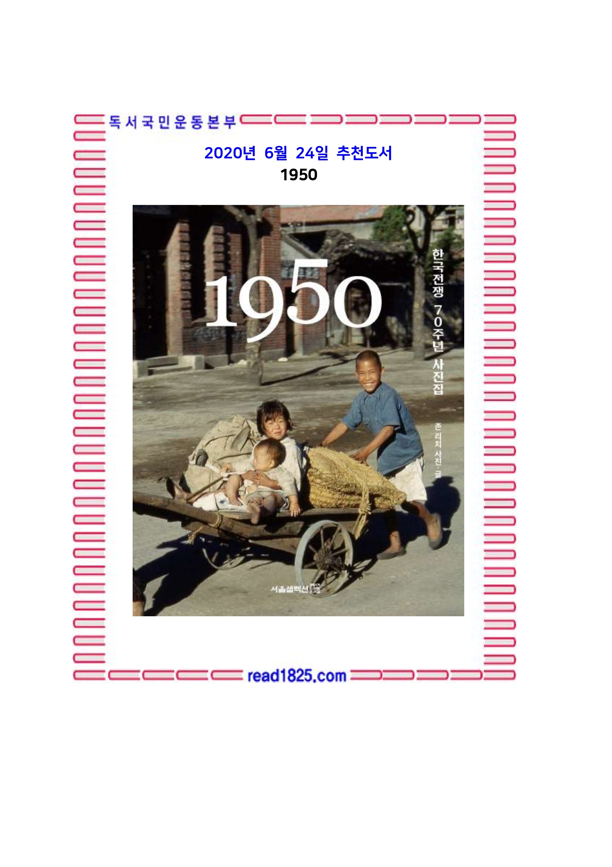 『1950』은 개전부터 휴전까지 한국전쟁을 곁에서 지켜본 종군기자 존 리치의 한국전쟁 컬러사진집이다. 무명의 참전용사들, 유엔군 장병들, 그리고 참혹한 전쟁 속에서도 희망을 잃지 않고 삶을 살아낸 사람들의 모습을 담았다. 『내셔널지오그래피』 기자들이 즐겨 사용한 코닥사의 전설적인 컬러필름인 ‘코다크롬’으로 찍은 사진들로, 그동안 흑백 이미지로만 인식되어온 한국전쟁을 생생하게 재현한다.