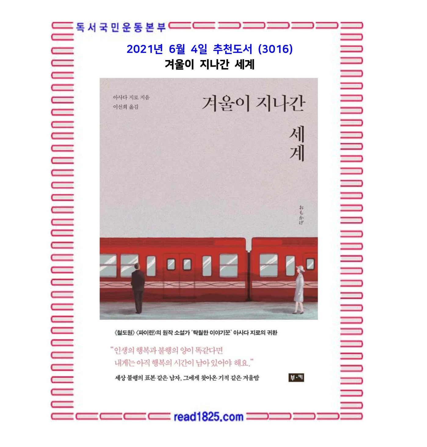 아사다 지로의 30년 문학 인생을 관통하는 주제인 ‘인간의 선의’에 대한 믿음과 ‘인생의 아름다움’에 대한 메시지 또한 그의 성장배경에서 기인한 것이다. 이러한 주제는 그가 나이를 먹은 것처럼《겨울이 지나간 세계》에서 더욱 원숙하게 드러나 빛을 발한다. 주인공 다케와키가 지하철에서 쓰러졌을 때 그의 나이는 예순다섯이었다. 고아에다 인생을 다시 쓰기 위해서 과거를 감춘 채 늙어버린 그는 위로를 받을 기회조차 없었다. 그런 그를 환상 속으로 데려가는 방문자들은 ‘잊지 않으면 살아갈 수 없었던 기억’을 들춰내 상처를 덧내면서도 그의 인생을 훤히 다 안다는 듯 너그럽게 위로해준다. “당신은 참 열심히 살았어요”라고 등을 다정하게 어루만져 주고, ‘정말 훌륭하게 살았네’라며 따뜻한 정종을 내밀면서. 그리고 소설 말미에 이르러 그들의 정체가 밝혀지면, 안온한 위로는 뜨거운 울음이 되어 돌아온다.
