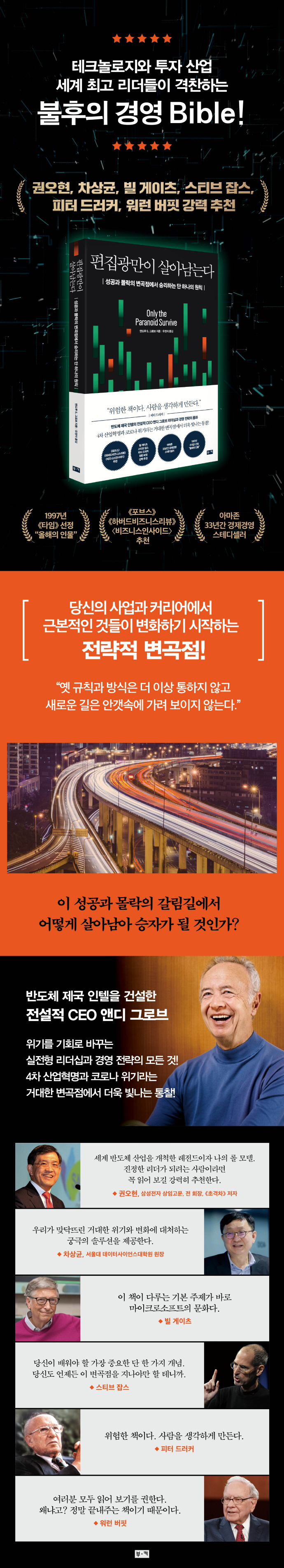반도체 제국 인텔을 건설한 전설적 CEO이자 디지털 혁명을 선도한 실리콘 밸리와 컴퓨터 산업의 “전설” 앤드루 그로브가 쓴 현대 경영의 고전. “편집광만이 살아남는다”는 모토와 “전략적 변곡점”이란 개념에 근거해 자신이 추구하는 경영 철학, 경영 전략, 리더십 원칙, 조직 관리, 기업 문화의 총화를 담아냈다. 편집광이란 항상 깨어 경계하는 사람 또는 그런 자세를 가리킨다. 전략적 변곡점이란 경쟁 방식부터 산업 구조까지 비즈니스를 둘러싼 모든 근본적인 것들이 변화하는 시점을 뜻한다.