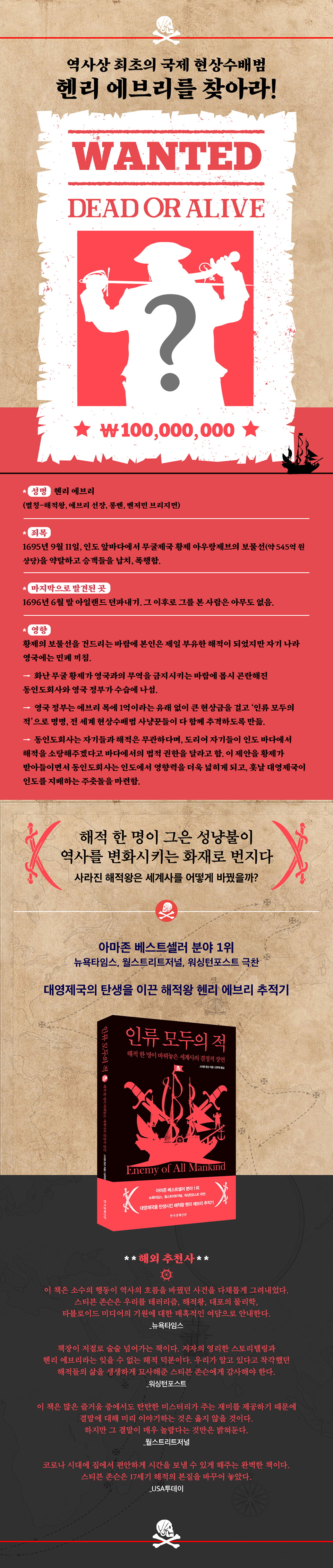 이 이야기는 한 명의 해적에 관한 실화다. 주인공은 헨리 에브리. 1695년 무굴제국 황제의 건스웨이호(현재 가치로 약 545억 원)를 손에 넣은, 세상에서 가장 부유한 해적, ‘해적왕’이다. 우리에게 잘 알려져 있는 ‘검은 수염’ 에드워드 티치, ‘블랙 샘’ 벨러미보다 한 세기 앞서 활약한 해적으로 이들에게 영감을 준 인물이며, 인류 역사상 ‘최초의 국제 현상수배범’이기도 하다. 어마어마한 보물을 실은 황제의 배를 약탈한 탓에 ‘인류 모두의 적’으로 명명되었던, 세계 최초로 1억 원이 넘는 현상금이 걸린 수배자였다.