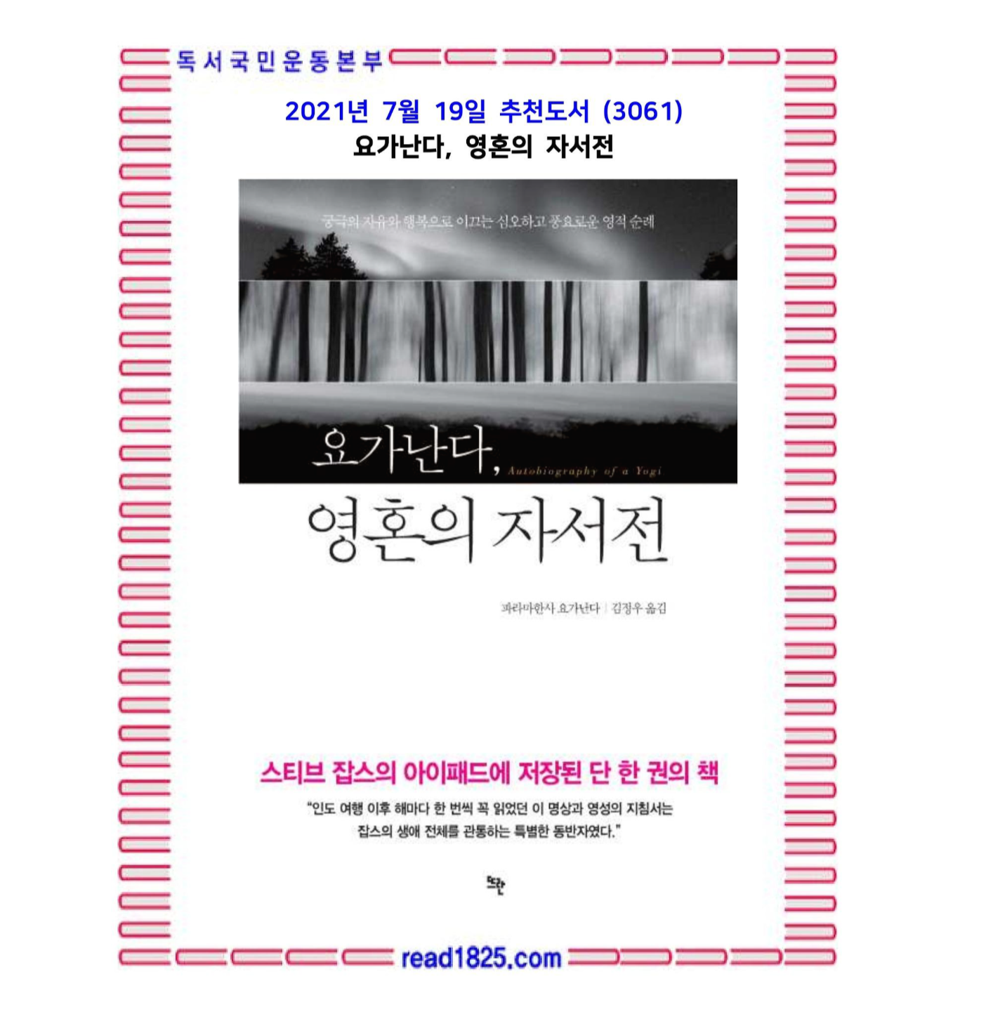 스티브 잡스의 아이패드에 저장된 단 한 권의 책이며, 그가 평생 동안 해마다 한 번씩 읽었던 책이다. 파라마한사 요가난다Paramahansa Yogananda는 평생 동안 진리의 길을 걸어간 인도의 영적 스승이다. 그의 전 생애가 담긴 [요가난다, 영혼의 자서전]은 한 진실한 구도자의 깨달음의 기록이자 인도의 요가 과학과 유구한 명상 전통에 대한 깊이 있는 안내서이다. 여기에는 삶과 죽음의 근본 문제, 편협한 에고의 허물을 벗고 진정한 자아를 찾는 법, 신과의 합일을 통해 궁극의 자유에 이르는 길 등 우리의 정신을 충만하게 채워주는 지혜들이 가득하다. 요가난다는 우리를 진리에 근거한 삶으로 이끈다. 그것은 인간 존재의 근원적인 불행이 제거되고 사랑, 행복, 기쁨, 환희, 평온으v로 빛나는 삶이다. 감각적 욕망에 대한 집착을 끊고 영적으로 진일보하는 삶이다. 이런 삶을 살 때 비로소 우리 안의 신성을 경험할 수 있으며, 인간의 본질이 곧 신이고 우주 그 자체라는 진리를 깨닫게 된다고 요가난다는 말한다. 20세기 최고의 영적도서로 선정되었으며, 전 세계 600만 독자들에게 지혜와 사랑의 불꽃을 일으킨 책이다.