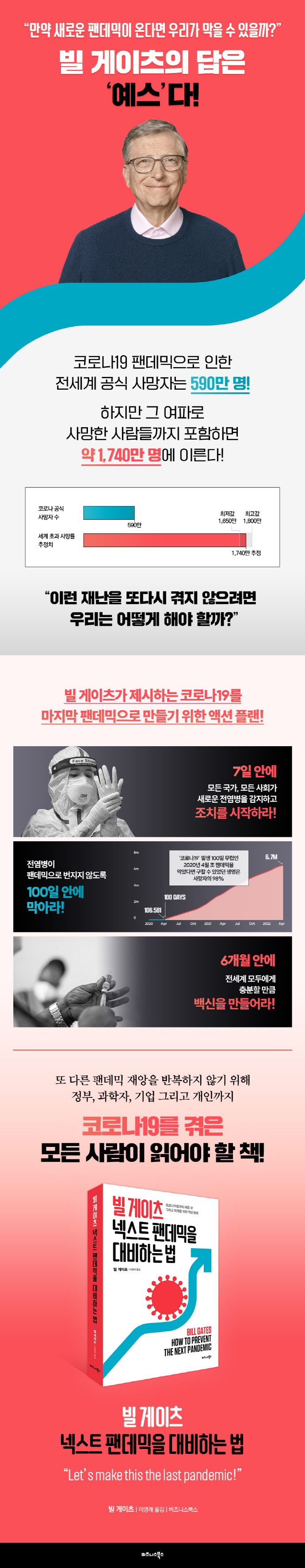 실제로 20세기 인류의 목숨을 앗아간 가장 치명적이었던 사건은 전쟁이 아니라 전염병이었다. 1918년 스페인 독감으로 약 5,000만 명이 사망했다. 게다가 1968년의 홍콩 독감, 2009년의 신종 플루, 2020년의 코로나19까지 팬데믹 발생 간격 또한 짧아지고 있다. 이처럼 재앙적인 전염병의 위협이 이어지는 와중에 ‘넥스트 팬데믹’이 온다면 우리가 막을 수 있을까? 놀랍게도 빌 게이츠의 답은 ‘예스’다. 그리고 그에 대한 설명과 해답을 이번 신간에 담았다.