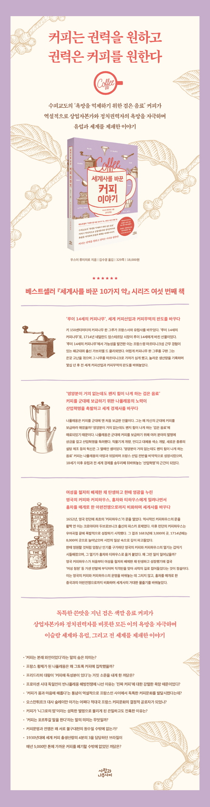 교보문고 65주 연속 역사 분야 베스트셀러(『세계사를 바꾼 10가지 약』), 교보문고 ‘2019년을 빛낸 역사책 100권’ 1위(『세계사를 바꾼 13가지 식물』), 2021년 교육청 학생교육문화원 추천도서(『세계사를 바꾼 37가지 물고기 이야기』), 행복한 아침독서 추천도서(『세계사를 바꾼 10가지 약』『세계사를 바꾼 13가지 식물』『세계사를 바꾼 37가지 물고기 이야기』『세계사를 바꾼 10가지 감염병』), 학교도서관저널 추천도서(『세계사를 바꾼 13가지 식물』『세계사를 바꾼 37가지 물고기 이야기), 교보문고 CEO를 위한 북모닝도서(『세계사를 바꾼 13가지 식물』『세계사를 바꾼 37가지 물고기 이야기』『세계사를 바꾼 10가지 감염병』) 등 주요 온 · 오프라인서점에서 베스트&스테디셀러로 자리 잡고 꾸준히 판매되며 내용과 가치 면에서도 인정받은 ‘세계사를 바꾼’ 시리즈. 사람과나무사이 출판사가 이 시리즈 여섯 번째 책을 출간했다. 『세계사를 바꾼 커피 이야기』가 바로 그 책.