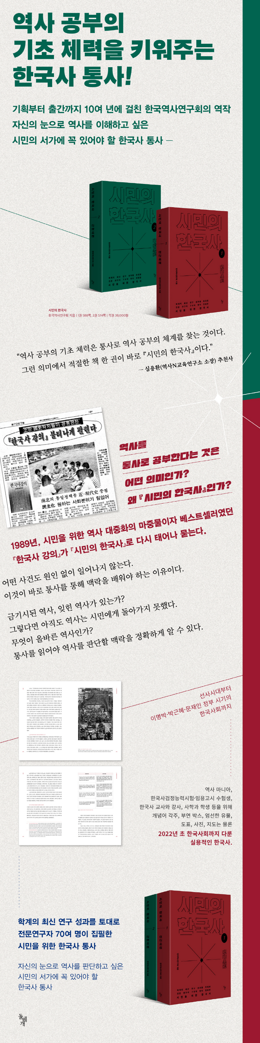 선사시대부터 현대까지, 장구한 우리 역사를 통시적으로 담아낸 한국사 통사가 출간됐다. 1988년 창립한 이래, 국내 역사학계 중 가장 많은 회원을 보유하며 학술과 교양 각 부문에서 꾸준한 성과를 축적해온 한국역사연구회의 공동 작업물이다. 2013년 ‘교학사 책 파동’과 2015년 ‘국정 교과서 파동’이 그 발단으로, 권력에 무너진 역사 서술에 맞서 제대로 된 한국사를 만들어보자는 문제의식 아래 기획됐다. 국내 전문 연구자들을 필진으로 채우고, 획일화된 해석에 거리를 두며 최신 연구 성과까지 반영해보자는 계획이었다. 구성 확정, 필자 섭외, 집필, 교열 그리고 편집과 디자인 작업 등에 필요한 인내와 노력이 따르는 동안 애초의 이슈는 점점 사그라들었으나, 편찬위원회 내부의 출간 목적은 더욱 분명해졌다. 짧지 않은 준비 과정을 거치면서 사실 확인과 정보 면에서 아쉬운 자료들을 연이어 접했고, 이에 ‘교과서’를 넘어 누구에게나 권할 수 있는 적확한 ‘우리 역사 이야기’를 남기자는 사명감으로 확장됐던 것이다. 그런 점에서 제목인 ‘시민의 한국사’ 그리고 표지에 써 넣은 ‘시민을 위한’이라는 문구는 대한민국 시민 누구에게나 널리 읽히기를 바라는 마음을 담고 있다. 한국사에 깊은 관심을 갖고 역사서를 즐겨 읽는 일반인을 비롯해 한국사검정능력시험·임용고시 등을 준비하는 수험생, 한국사를 가르치는 교사와 강사 등에게 더없이 기쁜 소식으로 다가가리라 기대한다.
