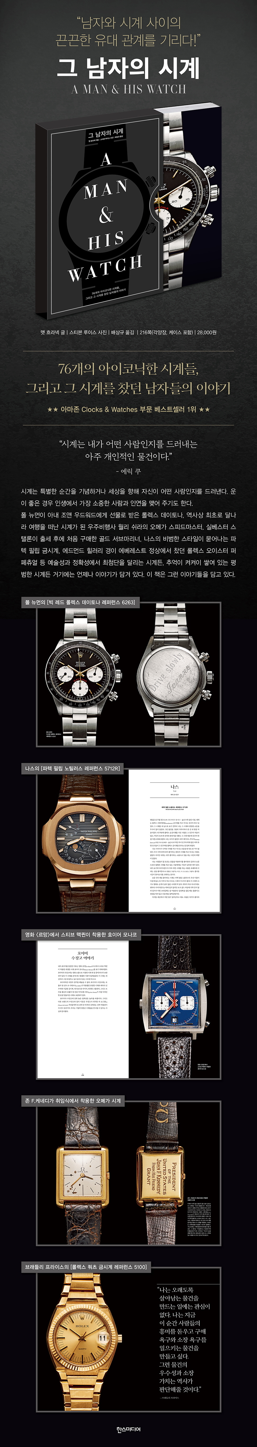 저자는 남자들이 차고 다니는 시계가 그들에게 정서적으로 커다란 의미가 있거나 아주 중요한 연결 고리로 작용할 때가 많다는 점을 깨닫고, 남자와 시계에 얽힌 사연들을 수집하기 시작했다. 폴 뉴먼이 아내 조앤 우드워드에게 선물로 받은 롤렉스 데이토나, 역사상 최초로 달나라 여행을 떠난 시계가 된 우주비행사 월리 쉬라의 오메가 스피드마스터, 실베스터 스탤론이 출세 후에 처음 구매한 골드 서브마리너, 나스의 비범한 스타일이 묻어나는 파텍 필립 금시계, 에드먼드 힐러리 경이 에베레스트 정상에서 찼던 롤렉스 오이스터 퍼페츄얼 등 예술성과 정확성에서 최첨단을 달리는 시계든, 추억이 켜켜이 쌓여 있는 평범한 시계든 모든 시계에는 언제나 이야기가 담겨 있다. 이 책은 그런 이야기들을 담고 있다.