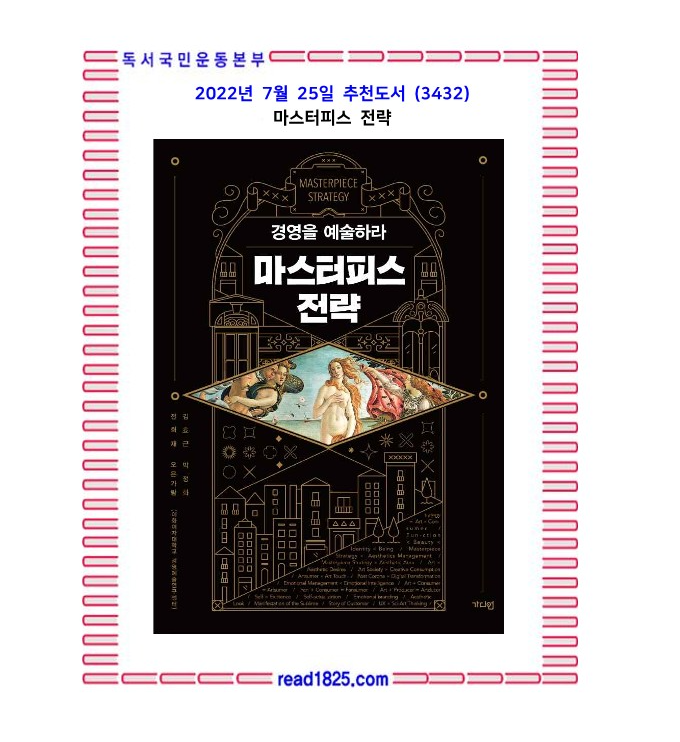 마스터피스를 만나고 구매하는 소비자들은 제품, 서비스와 특별한 애착관계가 형성된다. 팬덤이 일어나 소비자들만의 새로운 세계가 열리는 경험을 하게 된다. 저자가 정의하는 마스터피스는 ‘제품과 서비스가 기업의 브랜드를 넘어 창작자와 감상자가 만드는 예술적 무대에서 만나는 매력 넘치는 황홀감, 카타르시스에 이르게 하는 최고의 창작품’이다. 이 책에서 제시하는 미학의 명제들이 마스터피스 전략을 단단하게 뒷받침해준다.