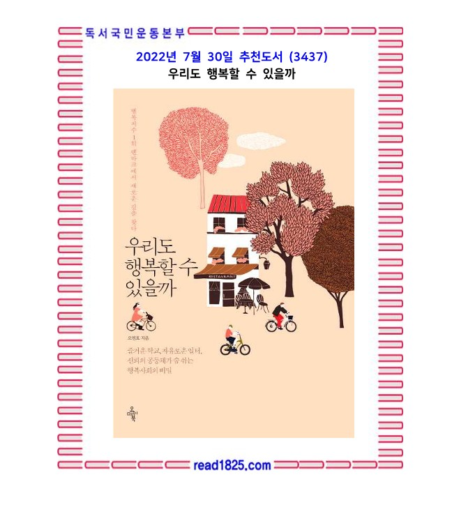 6가지 키워드로 살펴보는 행복의 비결『우리도 행복할 수 있을까』. UN이 발표한 세계행복보고서에 2년 연속 덴마크가 행복지수 1위를 대한민국은 41위에 머물렀다. 두 나라에는 무슨 차이가 있기에 사람들의 행복수준이 다른걸까? 저자는 그들이 생각하는 행복한 삶, 행복한 사회의 비결을 묻고자 덴마크 사회를 1년 6개월에 걸쳐 심층 취재하였다. 취재를 통해 밝혀낸 비밀을 6개의 키워드로 나열하고 사례와 분석, 시원한 통찰로 설명한다.