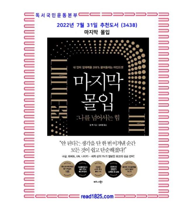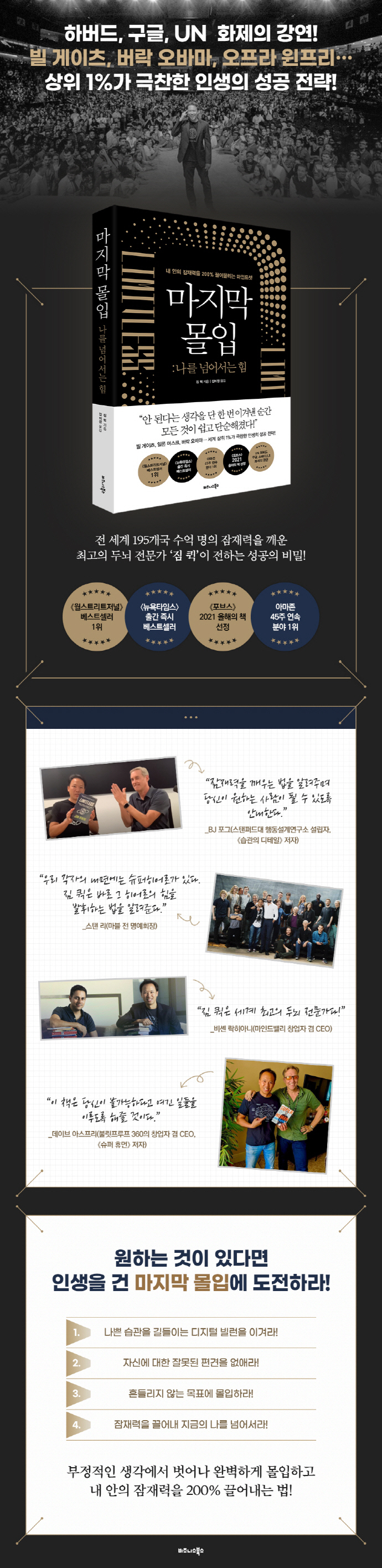 이러한 그의 극적인 변화와 성공 전략을 담아낸 책이 바로 《마지막 몰입: 나를 넘어서는 힘》이다. 이 책은 출간 즉시 〈뉴욕타임스〉 베스트셀러로 소개되고 《월스트리트저널》 베스트셀러 1위에 올랐으며 출간 이후 지금까지 45주 연속 아마존 분야 1위를 지키고 있다. 또한 스탠퍼드대학교 행동설계연구소 설립자 ‘BJ 포그’, 싱귤래리티대학교 공동설립자 ‘피터 디아만디스’, 마블 전 명예회장 ‘스탠 리’, 하버드대학교 신경학과 교수 ‘루돌프 탄지’ 등 각계각층의 저명인사들로부터 강력 추천을 받았으며 《포브스》에서는 ‘2021년 꼭 읽어야 할 필독서’로 이 책을 추천했다.