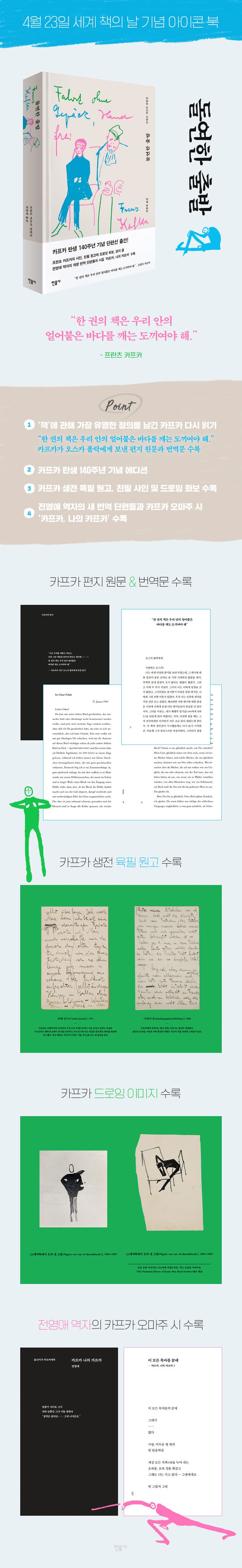 출구 없는 삶, 재앙처럼 닥친 초조함의 세계 묘사하며 20세기 문학의 징후를 보여 준 불멸의 작가 프란츠 카프카. 그의 탄생 140주년을 기념하는 단편선 『돌연한 출발』이 민음사에서 출간되었다. 이번 에디션은 4월 23일 ‘세계 책의 날’을 맞이하여 교보문고와 민음사가 공동으로 기획한 아이콘 북이다. 이 특별한 해를 기념하기 위하여 우리나라 독자들에게 가장 널리 알려진 대표작 「변신」을 비롯하여 「선고」, 「시골의사」(이 두 작품은 카프카 스스로도 만족했던 작품이다.), 「굴」(이 작품은 카프카가 죽기 전 원고들을 불태우게 할 때 유일하게 제외시킨 작품이다.) 등 주제에서나 문체에서나 카프카 문학의 정수를 엿볼 수 있는 서른두 편의 작품을 전영애 역자가 엄선했다. 아울러 이스라엘 국립 도서관에서 아카이빙한 카프카의 친필 원고와 “한 권의 책은 우리 안의 얼어붙은 바다를 깨는 도끼여야 해.”라는 명문장이 담겨 있는, 친구 오스카 폴락에게 보낸 카프카의 편지, 대학 시절 노트에 그린 드로잉을 한데 모아 화보로 구성하였고, 전영애 역자가 카프카의 자취를 따라 프라하 전역을 다니며 쓴 시집 ‘카프카, 나의 카프카’ 전편을 수록하여 카프카의 삶과 문학이 남긴 자취를 좇았다.
