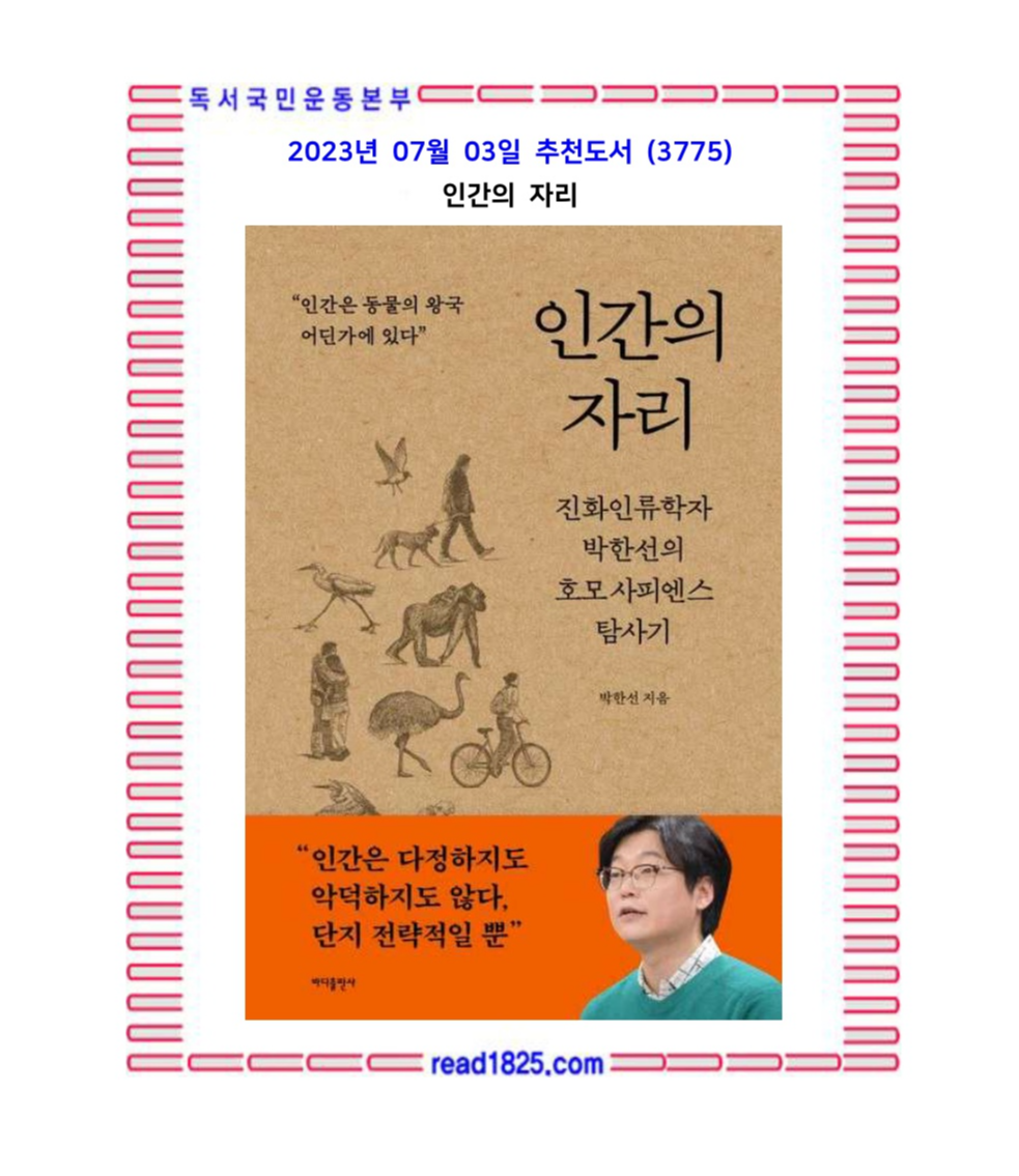 박한선은 인간의 우월함이라는 허위를 버려야 인류가 살 수 있다고 말한다. 공존 없는 독존이 얼마나 더 지속될 수 있겠는가. 이제 인정하자. 인간의 자리는 자연의 사다리 꼭대기에 있지 않다. 동물의 왕국 어딘가에 있다. 이에 『인간의 자리』는 우리가 잊어버린, 아니면 일부러 무시해버린 인간의 자리를 다시 찾고자 시도한다.