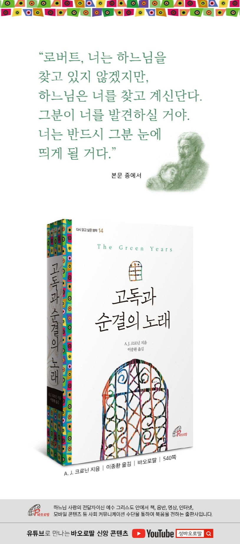 「천국의 열쇠」로 널리 알려진 A.J. 크로닌의 자전적 소설이 우리말로 출간됐다. 원제목은 ‘The Green Years’로, 1944년에 초판이 출간됐으며 우리나라에는 1974년에 처음 소개됐다. 바오로딸의 ‘다시 읽고 싶은 명작’ 14번째 도서다.