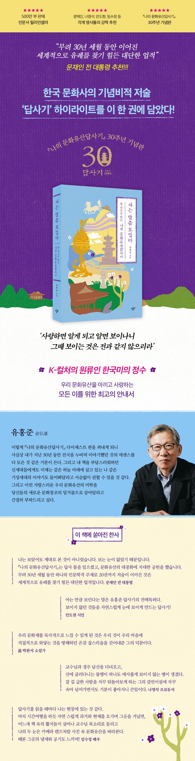 『아는 만큼 보인다』는 우리 국토의 명작과 명소를 명문으로 전해온 유홍준 교수의 ‘나의 문화유산답사기’ 시리즈 30주년 기념판이다. 500만 독자의 사랑을 받은 국내 최장수 베스트셀러 ‘답사기’ 시리즈에서 한국미의 정수이자 K-컬처의 원류를 보여주는 하이라이트 14편을 가려 뽑아 한 권에 담았다.