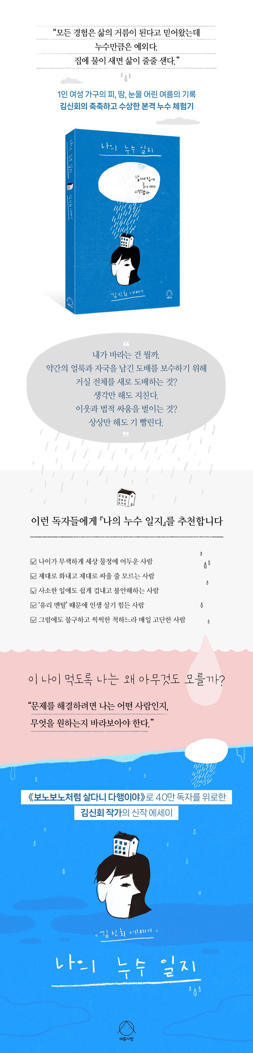‘집에 누수가 되면 인생이 누수된다!’는 작가의 포효는 마냥 울적하고 암울하지만은 않다. 울고 싶은 일 앞에서마저 결국 웃기고야 마는 위트와 자조 넘치는 글은 집의 누수를 넘어 인생의 누수를 건너고 있는 많은 독자들에게 공감과 눈물, 웃음을 동시에 불러일으킬 것이다.