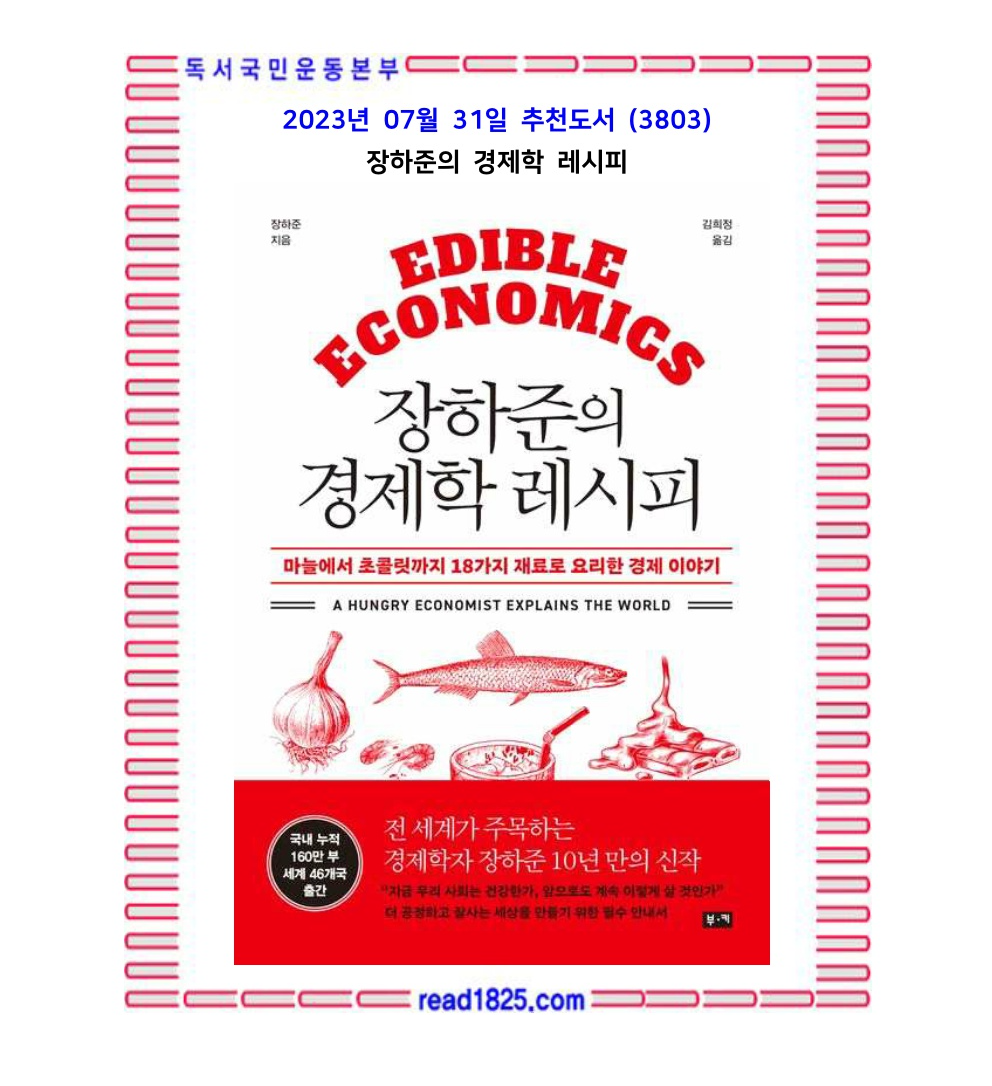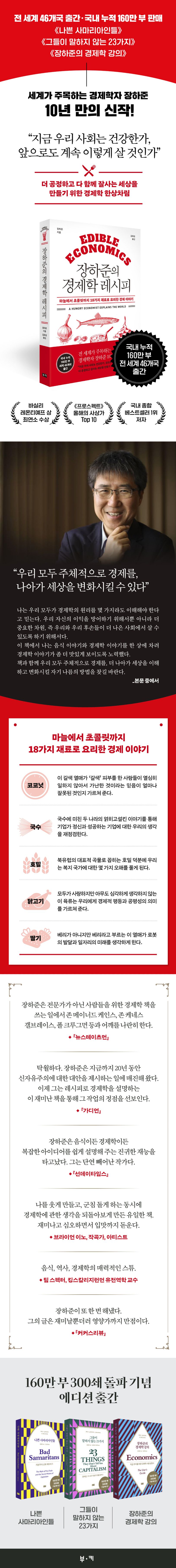 세계적 석학이자 베스트셀러 저자인 장하준 교수가 다시 돌아왔다. 이번에는 음식과 경제 이야기의 환상적인 컬레버레이션이다. 여기에 음식만이 아니라 역사, 정치, 사회, 과학 등 풍성한 재료를 한껏 버무려 냈다. 이 책에서 저자는 마늘에서 초콜릿까지 18가지 재료를 소재 삼아 경제와 관련한 각종 고정 관념과 편견, 오해를 깨뜨리면서 다 함께 더 잘사는 세상을 만드는 방법과 비전을 제시한다.
