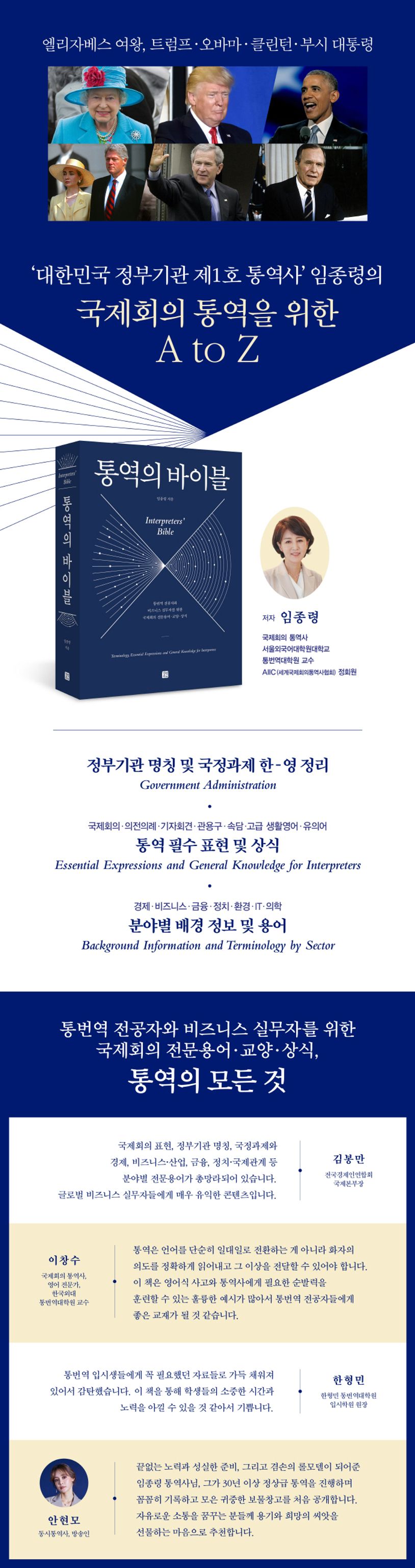 전문통역을 하면 할수록 내용과 배경지식이 중요함을 더 절실히 깨닫게 됩니다. 필요한 정보를 검색하고 용어를 찾고 정리하는 일련의 과정들은 힘들고 고단한 일입니다. 하지만 훌륭한 통역사가 되기 위해서 여러분이 결코 포기해서는 안 될 과정입니다. 32년의 짧지 않은 시간 통역사의 길을 걸어오면서 오류 없는 정확한 통역을 해내기 위해 끊임없이 공부했던 시간이 있었습니다. 그리고 그 과정에서 하나하나 모았던 용어와 표현, 배경정보들을 이 책에 차곡차곡 정리하여 담았습니다. 험난한 여정이 될 수 있는 통역사의 길을 함께 할 소중한 후배들에게 보잘것없는 저의 자산을 나누고자 합니다.