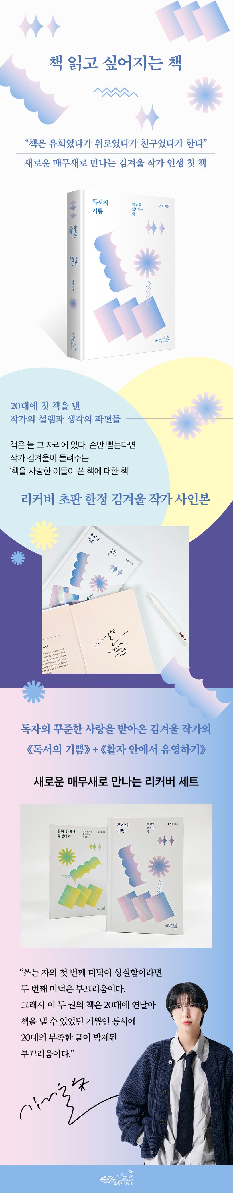 《독서의 기쁨》은 2018년 출간 이후 독자의 사랑을 꾸준히 받아온 스테디셀러이기도 하다. 이번 기회에 작가의 두 번째 책 《활자 안에서 유영하기》와 함께 리커버 세트로 묶었다. 20대에 첫 책을 낸 작가의 설렘과 생각의 파편들을 느껴보시라.