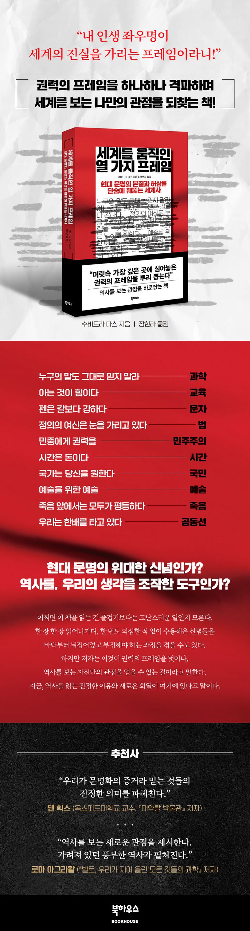 ‘누구의 말도 그대로 믿지 말라’, ‘아는 것이 힘이다’, ‘시간은 돈이다’. ‘펜은 칼보다 강하다’… 누구나 들어봤을 법한 이러한 말들은 믿어 의심치 않은 지혜로 우리 사회에서 수용되고 있다. 『세계를 움직인 열 가지 프레임』은 현대 문명의 성취이자, 오랜 시간 지켜온 신념으로 공유되는 열 가지 핵심 가치의 이면을 살펴보며, 역사와 우리의 생각에 어떤 영향을 끼쳤는지 파헤친다.