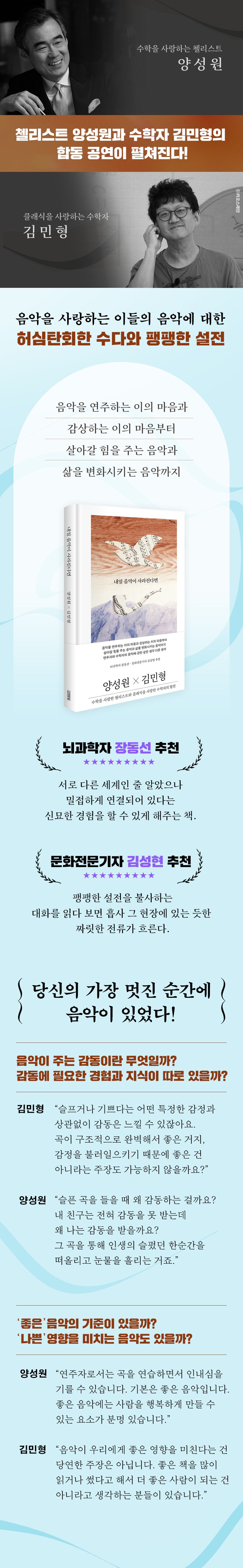 그럼에도, 끝끝내 미스터리로 남은 것이 있다. ‘왜 누구나 음악을 좋아하는가?’‘내일 음악이 사라진다면 우리는 과연 무엇으로 살아갈 수 있을까?’ 우리는 어떻게 대답할 수 있을까? 책을 덮으며 이런 질문을 하게 됐다면, 김민형 교수와 양성원 교수의 수학적 감성과 음악적 지성으로 채워진 환상적인 협연을 제대로 감상한 것이다. 그리고 다시, 당신과 저자들의 협연이 시작될 것이다.