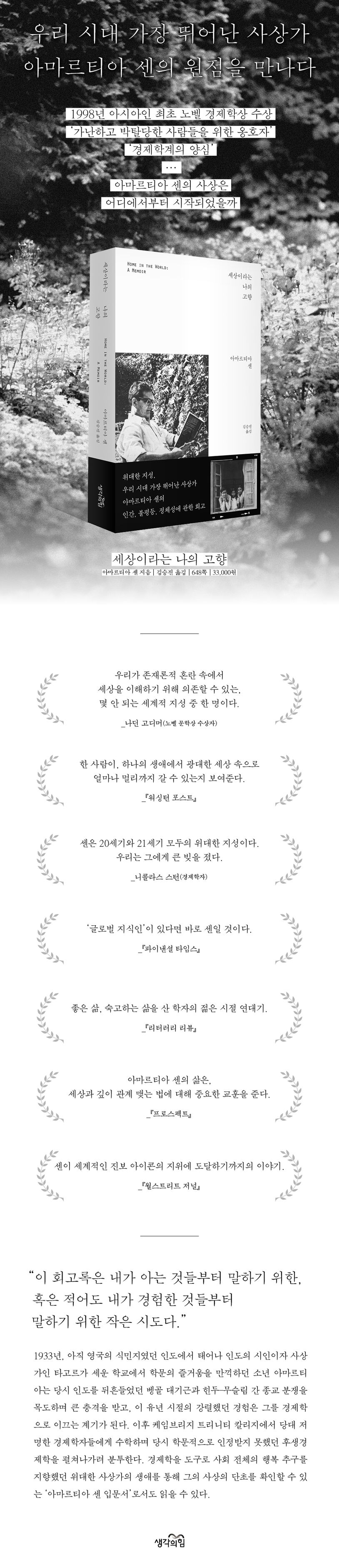 1998년 아시아인으로는 최초로 노벨 경제학상을 수상했으며, ‘가난하고 박탈당한 사람들을 위한 옹호자’ ‘경제학계의 양심’으로 불린 아마르티아 센. 그의 연구는 기근, 인간 개발 이론, 후생경제학, 빈곤 메커니즘, 젠더 불평등, 정치적 자유주의에 이르기까지 실로 방대하다. 대차대조표와 무역 거래, GDP에 집착하며 효용 극대화만을 추구하는 경제학에서 벗어나 인간의 ‘좋은 삶’을 위한 경제학으로 커다란 방향 전환을 이룬 아마르티아 센의 사상은 어디에서부터 시작되었을까. 『세상이라는 나의 고향』은 센이 경제학자의 지위를 다지기까지의 전반 생을 중심으로 술회하며 훗날 그가 추구하게 되는 학문적 관심사와 뿌리를 발견할 수 있는 계기를 제공한다.