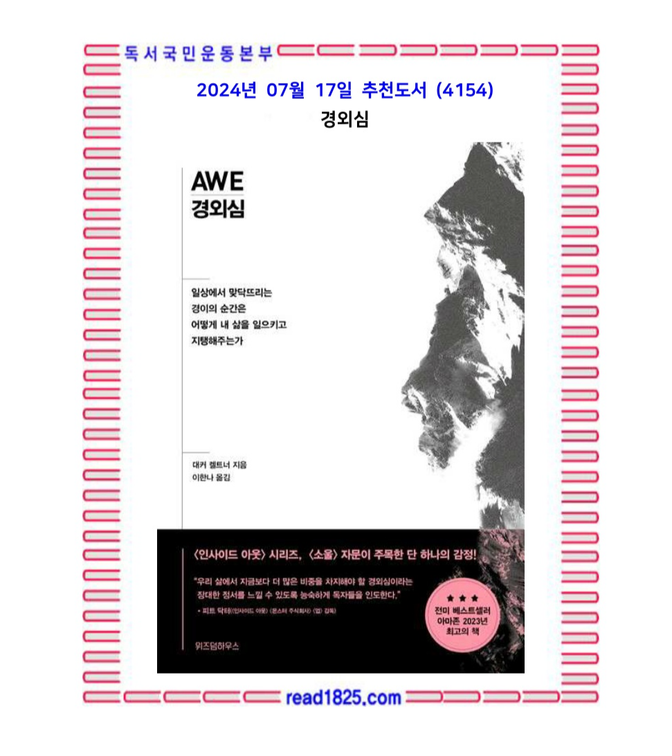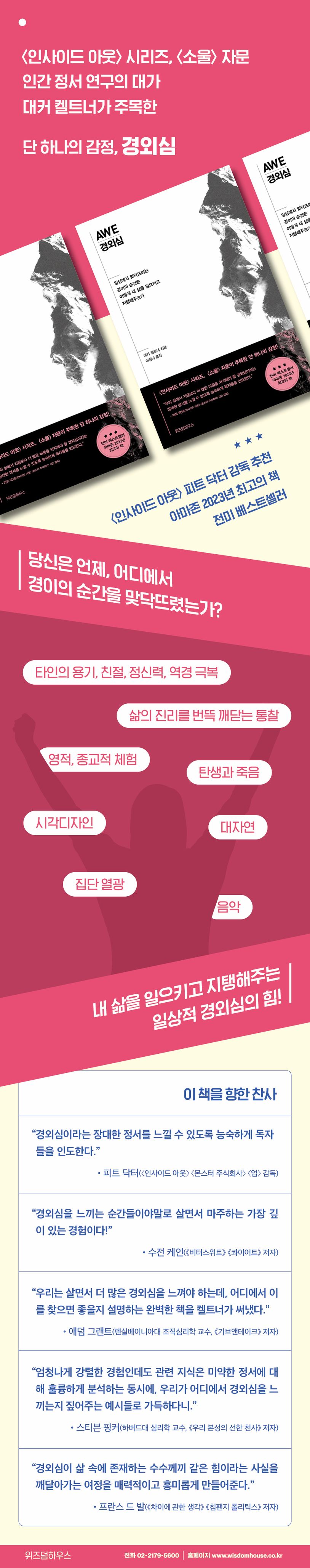 이러한 감정들을 설명할 수 있는 단 하나의 단어가 바로 ‘경외심’이다. 경외심이란 우리가 이해할 수 없는 어떤 거대한 신비를 마주했을 때 경험하는 정서다. 하지만 역설적으로 일상 속에서, 언제 어디에서든 맞닥뜨릴 수 있는 정서이기도 하다. 우리는 저마다 자신만의 의미 있는 방식으로 경외심을 찾아낼 수 있다. 그리고 경외심을 더 많이 경험하면 할수록 행복하고 충만한 삶에 더 가까이 다가갈 수 있다.