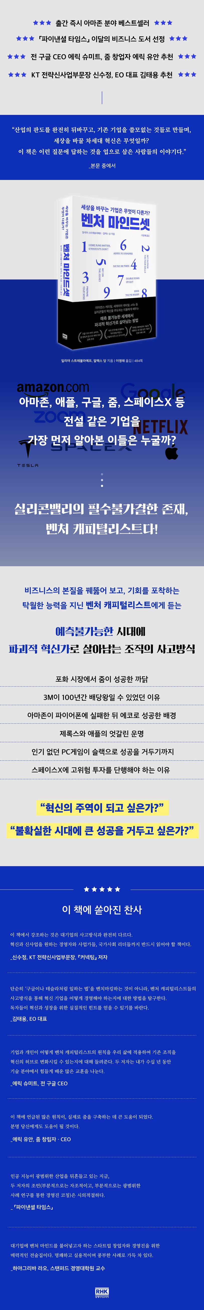 세상은 변하고 있다. 지금까지는 익숙한 이야기(개인용 컴퓨터, 상용 인터넷, 스마트폰, 소셜 네트워크, 식물성 고기, 민간 우주 로켓의 개발)에서 주목받은 것은 언제나 창업자였다. 우리는 미래에 대한 비전이 현실화되도록 몰아붙이는 기업가 정신을 가진 특별한 사람들에게 매료된다. 하지만 그들도 그들의 비전에 자금을 댄 투자자들이 없었다면 그런 일을 해내지 못했을 것이다. 벤처 캐피털은 단순히 세상을 바꾸는 기업들의 성장에 자금을 지원한 것이 아니라, 성공과 실패에 대한 독특한 접근방식을 전수했고, 이는 그들이 지원한 모든 기업의 본질에 스며들었다. 우리는 이런 독특한 사고방식과 업무 방식을 벤처 마인드셋이라고 부른다.