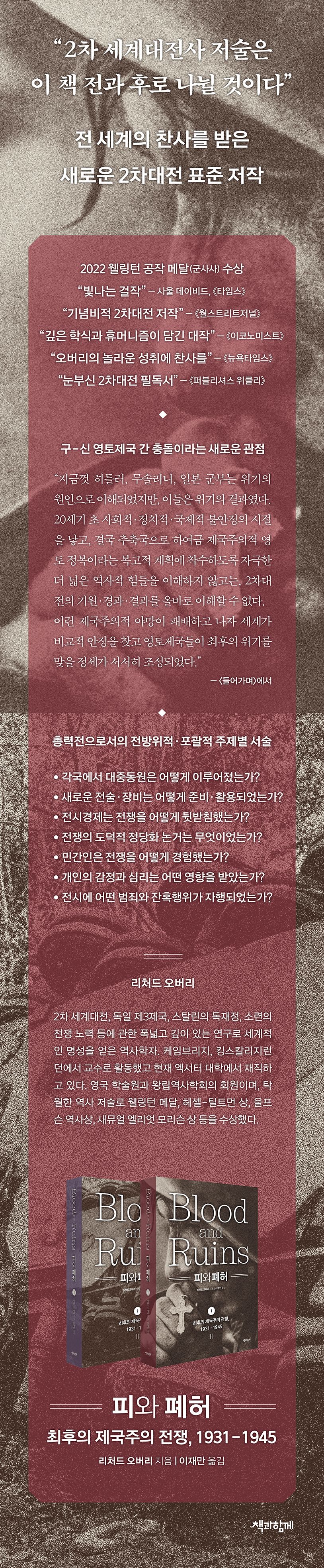 2차 세계대전 연구를 선도해온 역사학자 리처드 오버리의 《피와 폐허》는 2차대전의 기원, 경과, 여파를 새로운 관점으로 조명한다. 오버리는 이 전쟁이 ‘최후의 제국주의 전쟁’이었다고 주장한다. 전 세계에서 거의 한 세기에 걸친 제국주의 팽창의 세월이 1930년대와 1940년대 초에 이르러 독일·이탈리아·일본의 영토 야망으로 절정에 달한 뒤, 인류 역사상 가장 규모가 크고 값비싼 전쟁으로 빠져들었고, 1945년 이후 모든 영토제국의 종말로 이어졌다는 것이다. 이러한 관점에서 그는 일본군이 만주사변을 일으킨 1931년부터 시작된 ‘장기 2차대전’을 새롭게 조명한다.