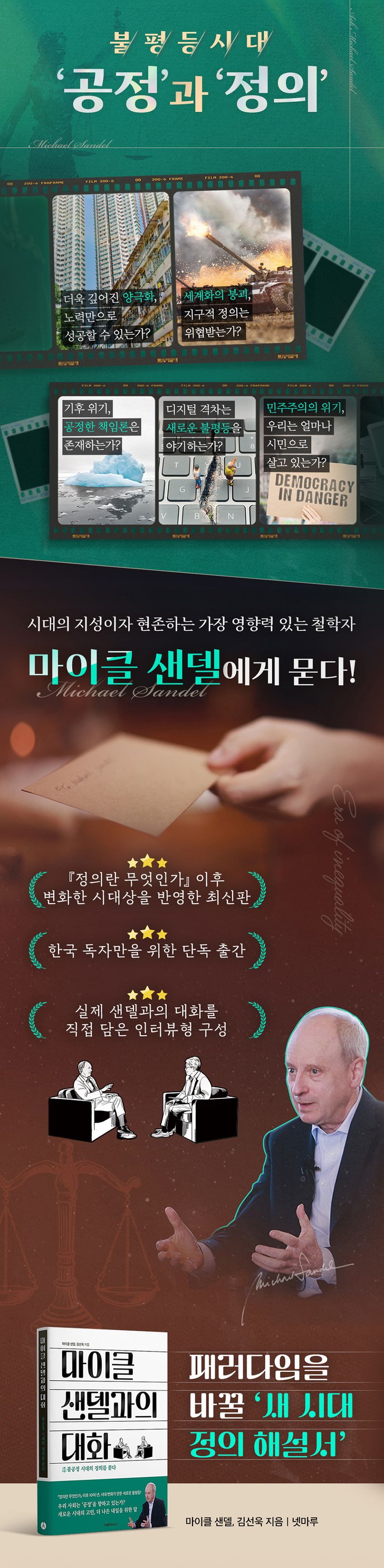 2010년 한국 사회에 정의 열풍을 일으킨 마이클 샌델. 많은 사람들이 우리 사회의 정의와 공정을 뜨겁게 희망했다. 10년 이상의 시간이 흐른 지금, 우리는 어디까지 왔을까? 사회, 과학기술, 경제, 환경, 정치 등 우리 삶의 거의 모든 분야에서 많은 것이 변화하는 동안 사람들의 생각과 행동도 달라졌을까? 새로운 시대의 고민을 나누고, 더 나은 내일을 위한 답을 듣고자 마이클 샌델 교수와 더 깊은 대화를 시도했다.