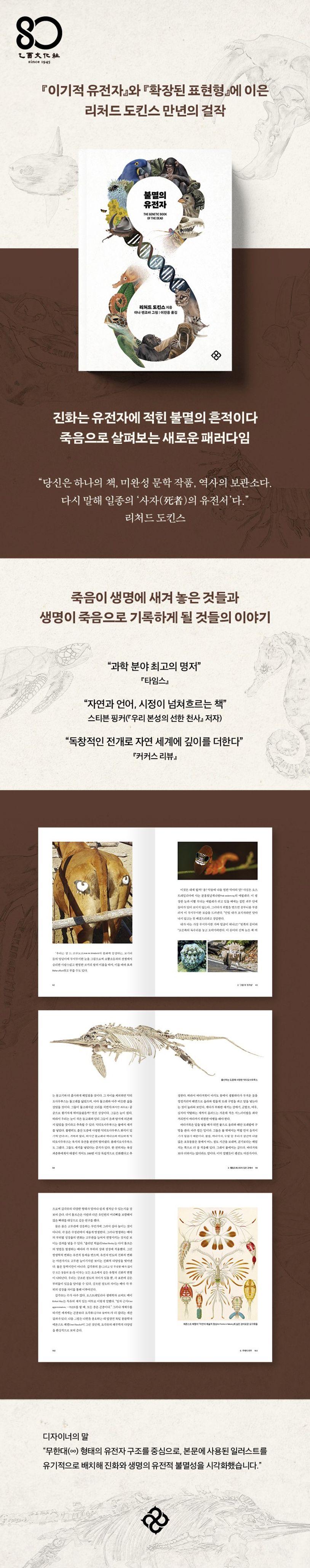 이 외에도 책에서는 다양하고 진귀한 생물들의 사례를 들어가며 죽음과 이를 뛰어넘는 유전의 힘을 설명한다. 이를 통해 도킨스가 왜 최고의 과학자이자 저술가로서 독자들에게 사랑받는지를 명쾌하게 보여 준다. 본서는 그의 대표작인 『이기적 유전자』와 『확장된 표현형』을 잇는 또 하나의 과학서로 손색이 없는 걸작이라 할 수 있다.