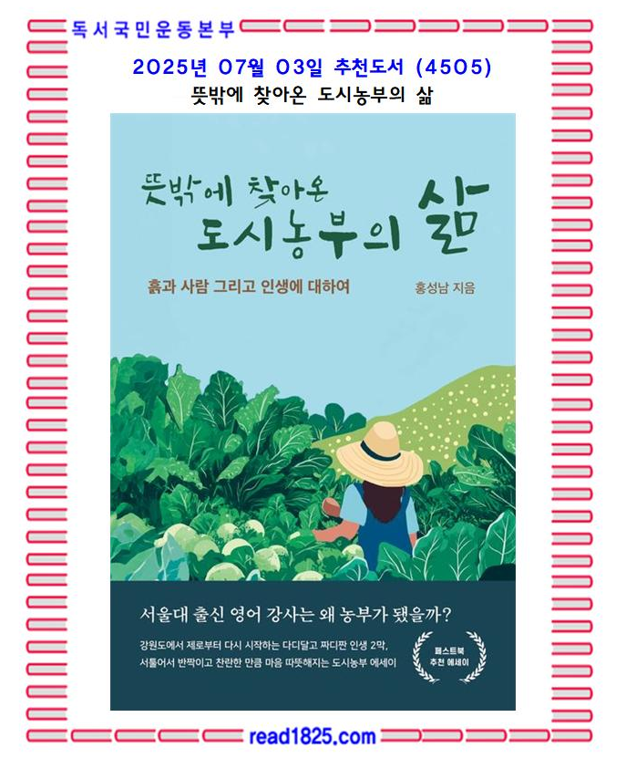 홍성남 작가의 『뜻밖에 찾아온 도시농부의 삶』은 도시에서의 익숙함을 뒤로하고 새로 시작한 농부의 삶에서 깨달은 인생의 교훈을 담은 도시농부 에세이다. 강원도의 자연 속에서 서툴지만 정성껏 살아가는 저자의 이야기는 단순한 농촌 생활을 넘어 삶의 본질과 마주하는 과정을 섬세하게 보여준다.
