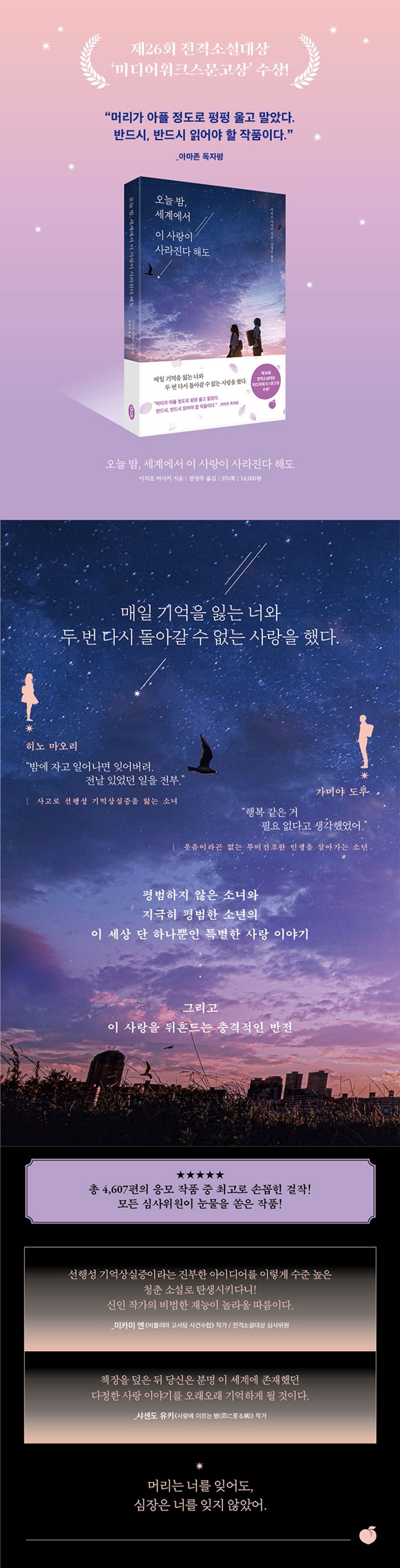 밤에 자고 일어나면 기억이 리셋되는 ‘선행성 기억상실증’을 앓는 소녀 히노 마오리와 무미건조한 인생을 살고 있는 평범한 고등학생 가미야 도루의 풋풋하고 애틋한 사랑 이야기『오늘 밤, 세계에서 이 사랑이 사라진다 해도』. 선행성 기억상실증이라는 익숙한 소재를 매우 수준 높은 청춘 소설로 탄생시켰다는 극찬을 받으며 제26회 전격소설대상 ‘미디어워크스문고상’을 수상한 이 작품은 간질간질한 청춘의 로맨스를 전혀 예측할 수 없는 국면으로 끌고 가, 깐깐하고 엄격한 심사위원 모두를 눈물 흘리게 만들었다는 흥미로운 뒷이야기를 남긴 소설이기도 하다.