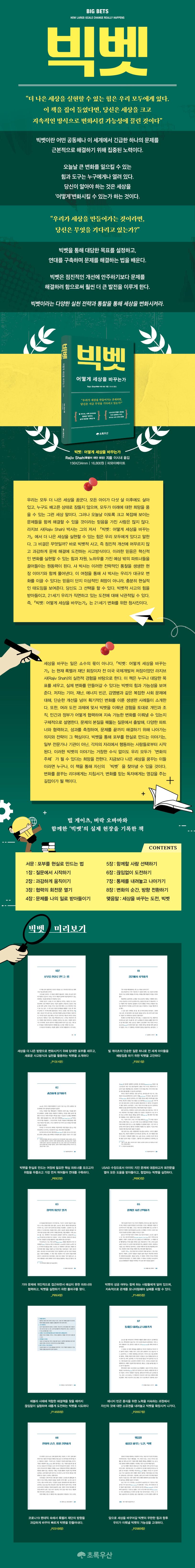 라지브 샤는 이 책에서 게이츠 재단, 미국 국제개발처(USAID), 록펠러 재단에서의 경험을 공유하면서 어떻게 전 지구를 무대로 ‘빅벳’이 실천될 수 있었는지를 보여준다. 그는 아프리카 기아 문제, 에볼라 발병, 코로나19 등 중대한 도전 과제들을 극복해 나가는 과정을 통해 빅벳의 실현 가능성을 설득력 있게 설명한다. 실패와 시행착오도 분명히 존재한다. 하지만 담대한 목표를 향한 지속적인 의지, 그리고 문제를 해결할 수 있다는 믿음을 공유하는 개인들의 연대를 통해 난관을 극복해 나갈 수 있음을 생생한 사례들을 통해 그려낸다.