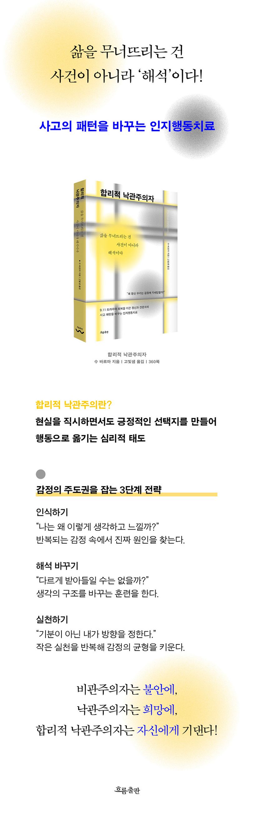 독자들은 책을 읽으며 스스로 변화의 방향을 설계할 수 있다. 책을 다 읽고 나면, 삶이 완전히 바뀌진 않더라도 ‘내가 나의 감정을 다룰 수 있다.’는 단단한 확신이 자라나 있을 것이다. 바로 그 믿음이, 합리적 낙관주의의 시작이다.