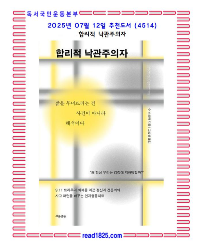우리는 왜 늘 감정에 흔들릴까? 왜 어떤 감정은 쉽게 사라지지 않고, 우리를 집어삼키는가? 《합리적 낙관주의자》는 정신과 전문의 수 바르마가, 수십 년의 임상 경험과 9.11 테러 트라우마 회복 프로젝트를 바탕으로 개발한 심리 훈련 시스템을 소개한다. 저자는 우리가 흔히 겪는 불안, 무기력, 분노 같은 감정이 외부 사건이 아닌, ‘해석’으로 증폭되고 지속된다는 점에 주목한다.