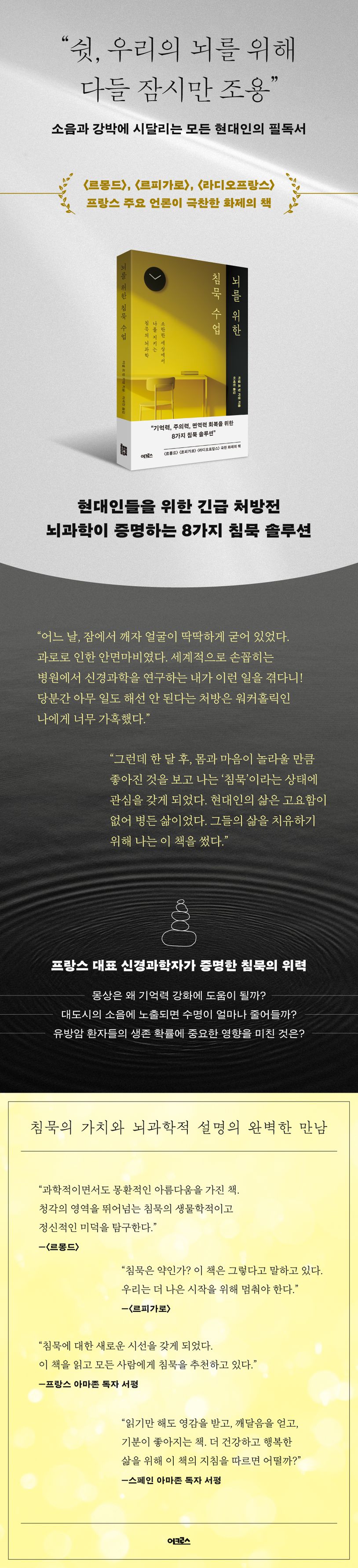 프랑스 국립보건의학연구소 소속 연구원이자 20년 경력의 신경과학자 미셸 르 방 키앵은 과로로 인해 안면마비 진단을 받는다. 신경 분야에서 세계적으로 손꼽히는 피티에 살페트리에르 대학병원에서 신경과학을 연구하던 그에게는 더욱더 충격적인 소식이었다. 강의와 프로젝트 등 모든 활동을 취소하고, 몇 주간 아무 일도 하지 말라는 처방에 워커홀릭인 그는 심한 부담을 느끼지만, 한 달 뒤 몸과 마음의 건강이 놀라울 만큼 좋아진 것을 보고 ‘침묵’이라는 상태에 관심을 갖게 된다. 당시의 연구와 깨달음의 결과가 바로 이 책 《뇌를 위한 침묵 수업》이다.