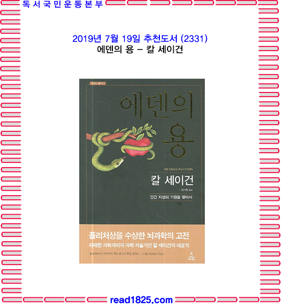 『사이언스 클래식』제6권《에덴의 용》. 이 책은 베스트셀러「코스모스」의 저자 칼 세이건의 저서로 1978년 퓰리처상 수상작을 번역한 것이다. 대폭발에서 시작된 우주의 진화와 인류의 등장과 진화에 이르기까지 150억년의 시간을 넘어 인간의 뇌가 어떻게 발달했는가에 대하여 설명한다.