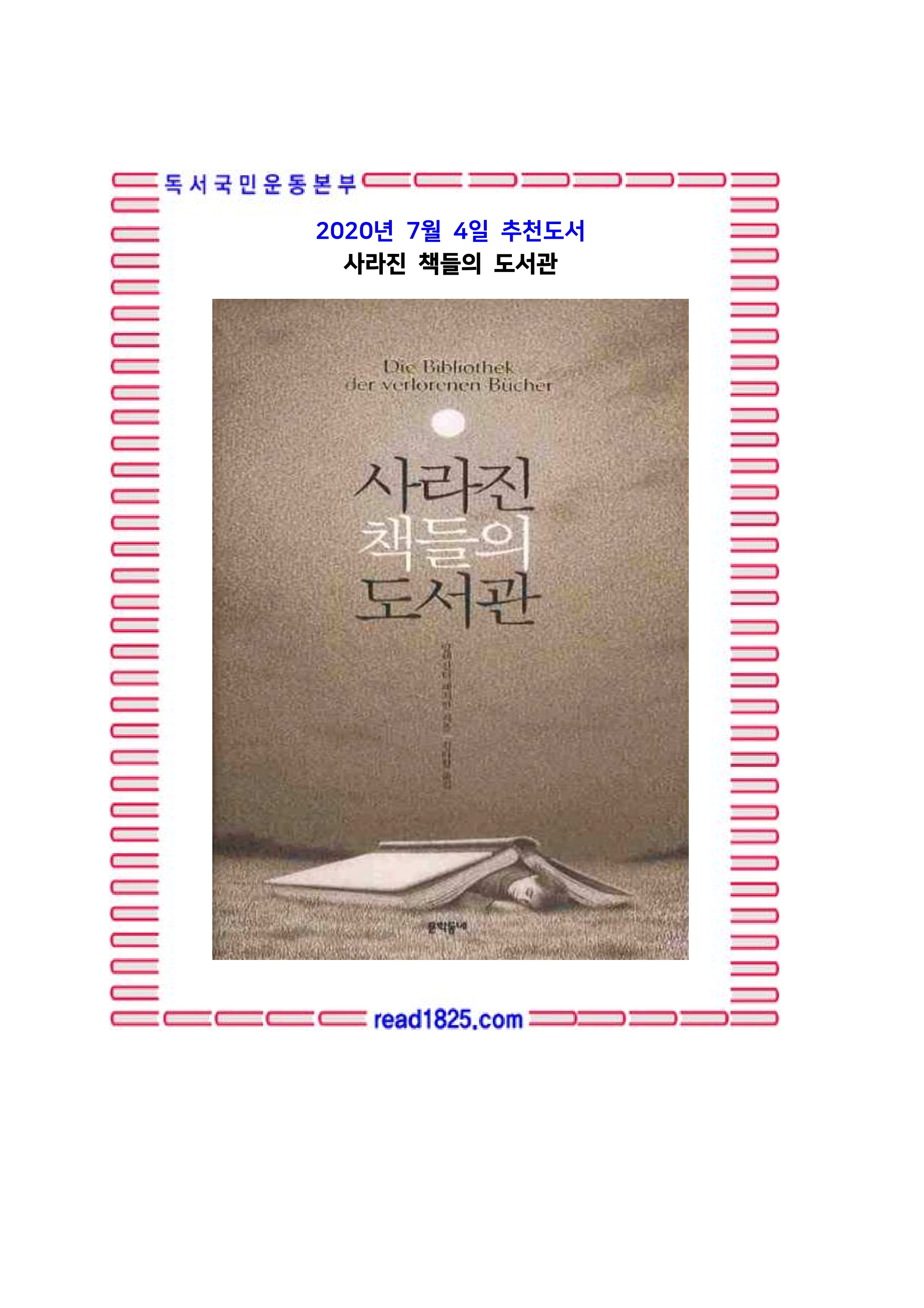 다양한 이유로 사라진 책에 관한 에피소드를 담은『사라진 책들의 도서관』. 이 책은 저자가 '사라진 책들의 도서관'이라는 가상의 공간을 통해 누구도 관심 갖지 않았던 사라진 책들의 서지학, 문학적 미시사를 흥미롭게 풀어낸다.