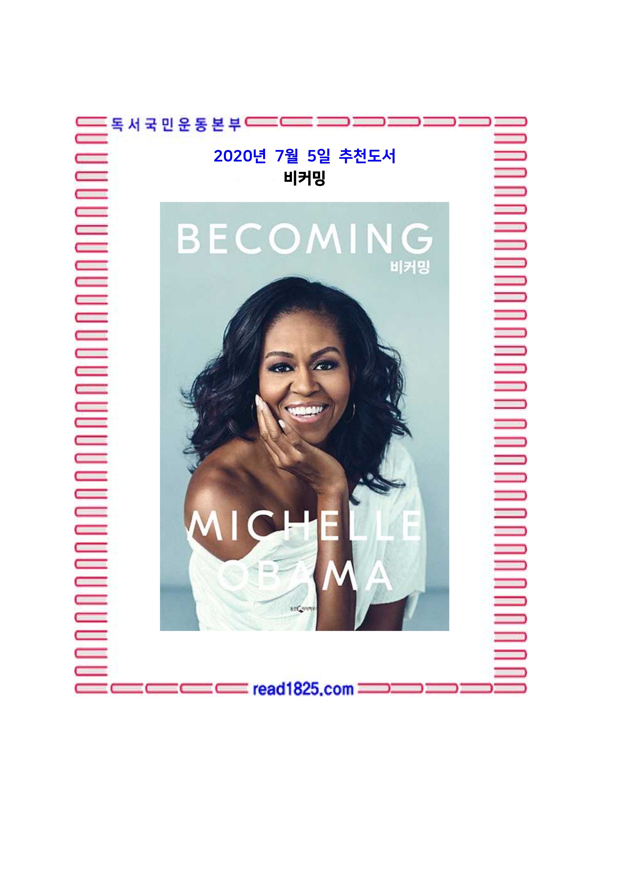 이 책 『비커밍(Becoming)』은 미국 최초의 흑인 퍼스트레이디 미셸 오바마의 첫 자서전이다.