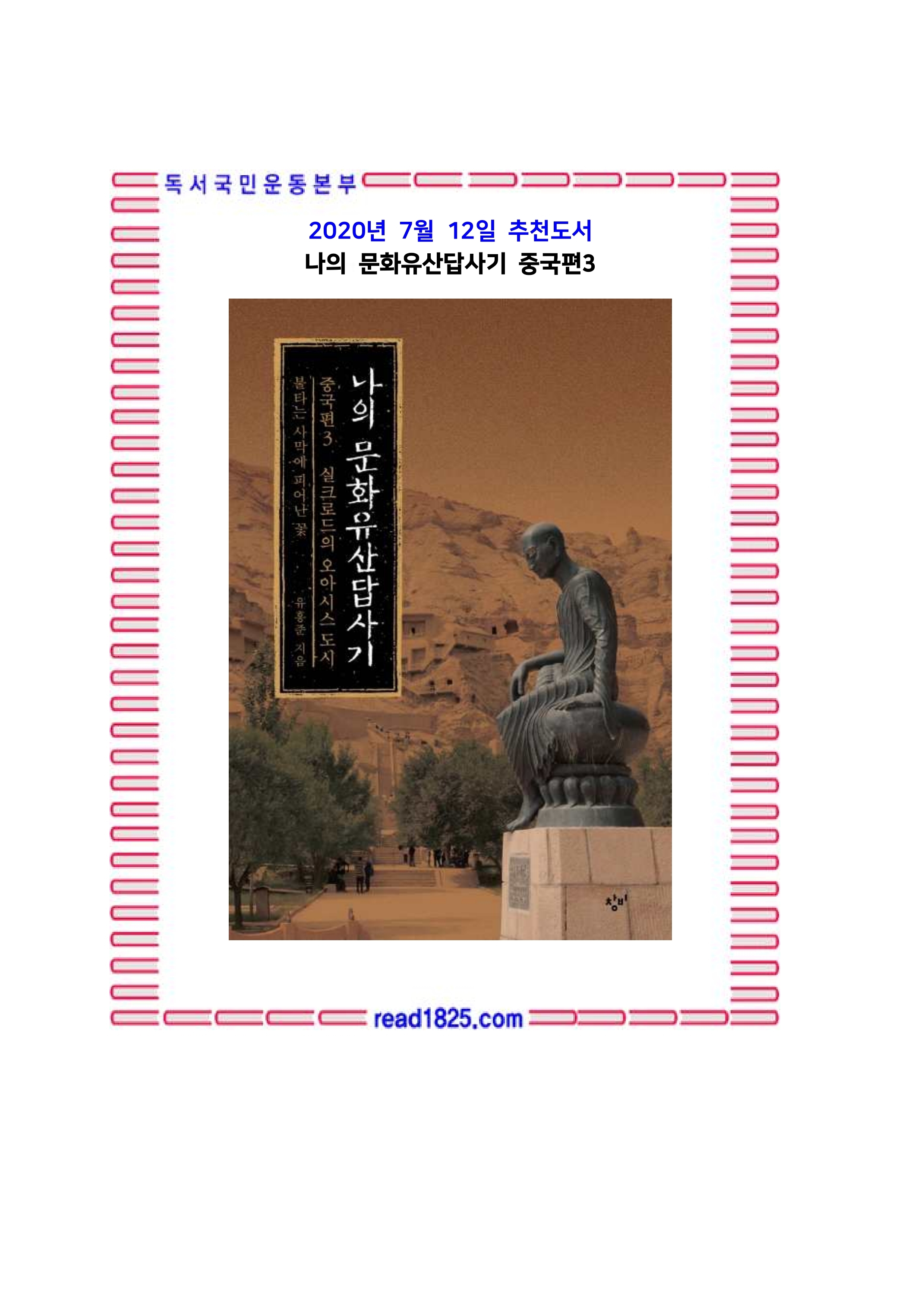 고대에 죽음의 땅 타클라마칸사막을 뛰어넘을 수 있었던 것은 돈과 신앙이었다. 물질적 삶과 정신적 삶에서 가장 갈급한 것을 채우기 위해서라면 고대인들은 목숨을 아까워하지 않았다. 그러나 오늘날 우리를 실크로드로 부르는 것은 문화와 역사, 그리고 미지의 세계를 알아가고자 하는 위대한 탐험정신이다. 20세기 초 제국주의 탐험가들은 그 정신을 약탈과 파괴로 소진해버렸을뿐더러 실크로드의 문화유산에 돌이킬 수 없는 상처를 남기는 데 써버렸지만, 이제 그 ‘야만의 시대’는 지나갔다. 새로운 문화를 만나 우리 문화를 더욱 아끼는 마음을 가다듬는 자세야말로 오늘날 사막마저 막지 못하는 ‘문화시민’의 위대한 열정일 것이다. 이번 『나의 문화유산답사기』 실크로드편을 통해 고대인의 여정 못지않은 위대한 순례길을 경험하길 권한다.