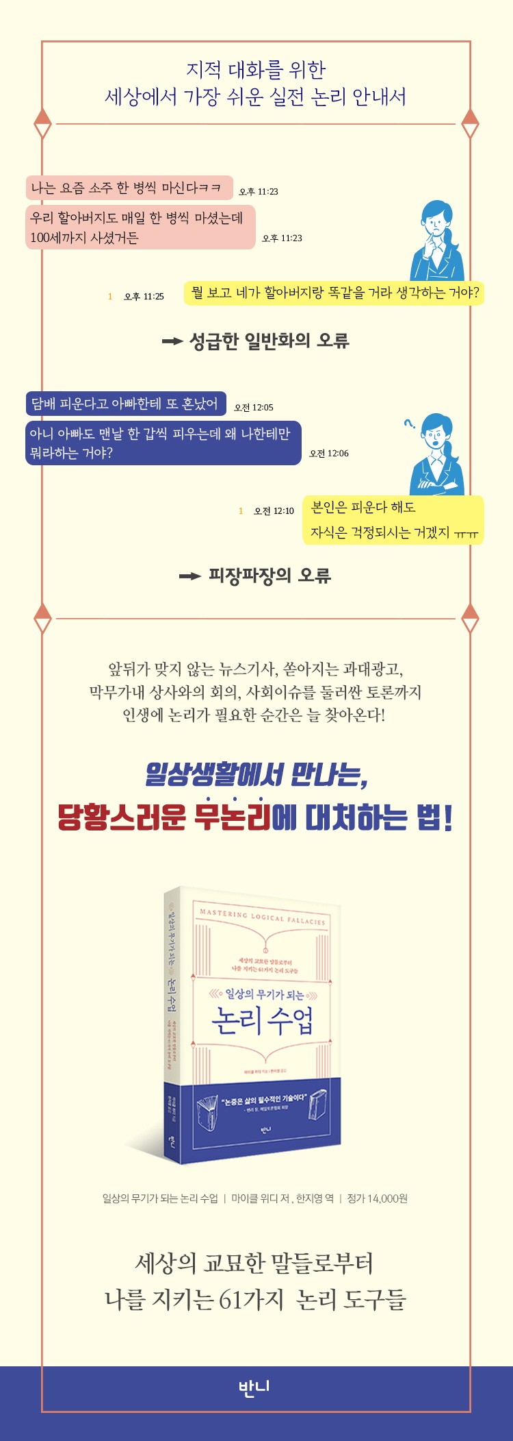 이러한 논리적 오류는 역사 속 중요한 논쟁마다 등장했고, 지금도 마찬가지다. 스마트폰 화면을 가득 채우는 과대광고, 선동이 넘치는 커뮤니티 게시판, 앞뒤가 안 맞는 뉴스기사, 정치인들의 볼썽사나운 공방, 뉴스 얘기를 하다 언성이 높아지는 식사자리에서도 논리를 가장한 속임수는 머리를 내민다. 사람들이 함께 어울려 살기를 그만두지 않는 한 논리는 우리 일상과 떼려야 뗄 수가 없는 것이다.