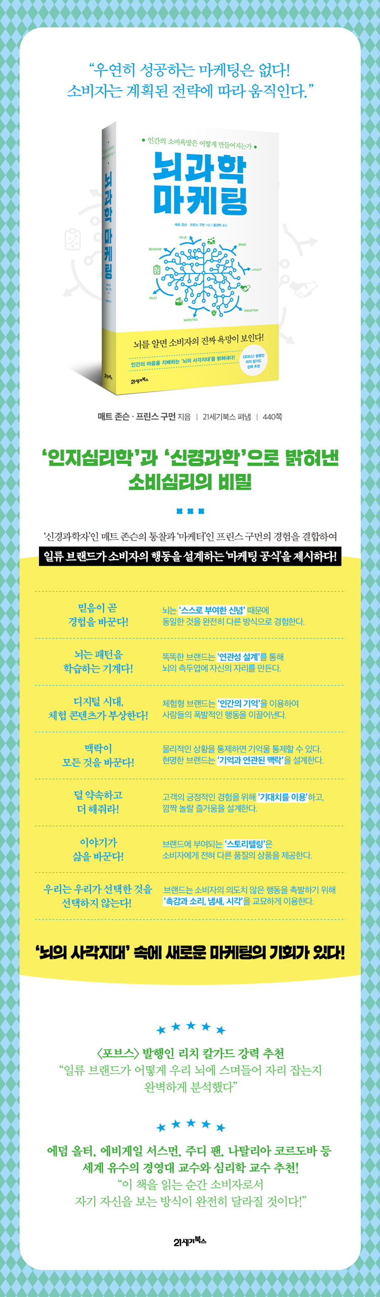 이 책은 인간의 기억과 경험, 기쁨과 고통, 인식과 실체를 조명하며, ‘신경과학자’로서 매트 존슨의 통찰과 ‘마케터’로서 프린스 구먼의 경험을 결합하여 ‘소비심리’의 보이지 않는 이면을 들여다보는 창을 제공한다. 매트 존슨은 소비자의 의사결정을 분석하기 위한 연구를 꾸준히 하며 나이키와 같은 대형 브랜드에 컨설팅을 하고 있으며, 프린스 구먼은 핀테크 기업에서 마케팅 디렉터로 근무하며 〈포브스〉〈워싱턴 포스트〉등의 뉴스 매체에 신경마케팅과 관련한 다양한 글을 기고하고 있다. 저자들은 외부의 객관적인 현실과 소비자의 인식 사이의 공백을 밝혀내며 ‘새로운 마케팅의 기회’에 대해 다양한 사례를 들어 언급한다.