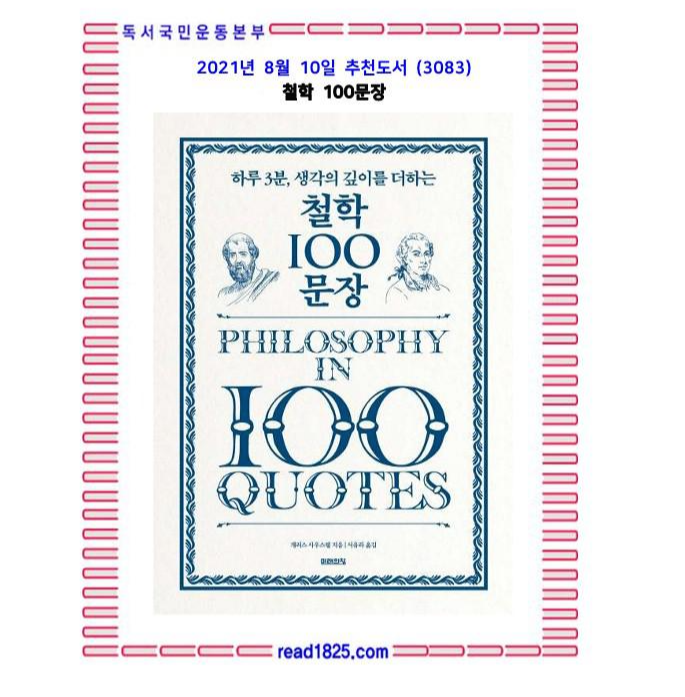 비트겐슈타인의 “철학은 언어를 무기로 인류의 지성에 걸린 주문과 싸우는 전투다”라는 말처럼 철학은 인간에 대해 깊이 있게 사유하는 학문이다. 2,500년의 역사를 가진 철학을 단 100문장으로 요약한다는 것이 가능할까?라는 의문이 들 수도 있으나 《하루 3분, 생각의 깊이를 더하는 철학 100문장》은 철학의 맛을 느껴볼 수 있는 철학 입문자들에게 유용한 책이다. 철학에 관한 100가지의 명언들을 연대기 순으로 정리하여 철학의 흐름을 정리하고 있다. 위대한 철학자들의 삶과 업적을 살펴보면서 각각의 철학 명언들이 어떻게 탄생했는지, 더 넓은 맥락 속에서 그 의미를 함께 살펴볼 수 있다. 이를 통해 철학적 사유가 우리의 일상생활에서 얼마나 밀접한 관계를 맺고 있는지 보여준다. 더불어 명언들의 의미를 직관적으로 파악할 수 있도록 다양한 이미지들과 그래프들이 함께 소개되어 있다는 것이 이 책의 큰 매력이다. 진지하게만 다가가야 할 것 같았던 철학을 가볍게 읽어나가며 철학은 어려울 것 같다는 막연한 두려움을 없앨 수 있는 좋은 기초 입문서가 될 것이다.