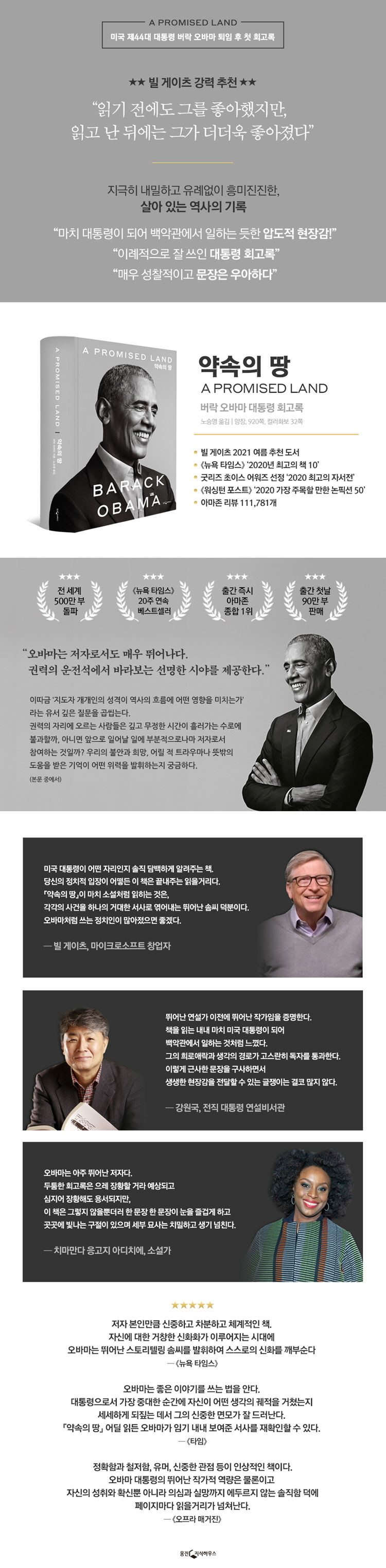 그가 서두에서 밝힌바 “이 모든 이야기를 500쪽 안에 담을 수 있을 줄 알았다. 1년이면 다 쓸 거라 예상했”지만, 책은 결국 두 권으로 나뉘었고 『약속의 땅』은 그중 1권이며 920쪽에 달한다. 압도적 두께는 제 값을 하고도 남았다. 흥미진진한 사건과 치밀한 디테일과 우아한 문장이 어우러진 이 책에 언론과 평단은 “최고의 대통령 회고록” “유례없이 잘 쓰인 책” “현실 정치의 진면목을 보여주는 책” 등의 찬사를 쏟아냈다. 빌 게이츠는 마치 소설처럼 읽힌다며 “끝내주는 읽을거리”로 강력 추천했다.
