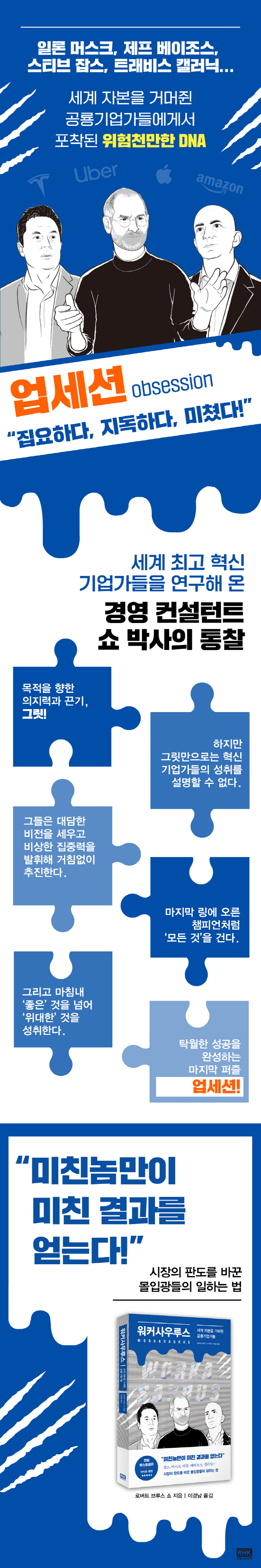 경영전략 컨설턴트이자 예일 대학교에서 조직행동학 박사 학위를 받은 로버트 브루스 쇼Robert Bruce Shaw 박사는 애플과 아마존, 테슬라, 우버, 에어비앤비, 넷플릭스 등 위기에도 흔들림 없이 초고속 성장을 이어가는 첨단 기업들을 오랫동안 연구했다. 해당 기업들의 조직과 팀 운영 방식, 수익모델과 경영전략 등을 파헤쳐 가던 그는, 이들 기업엔 회사 브랜드만큼이나 유명한 리더가 있고, 그들 모두 특별한 사명감으로 일에 자신의 삶을 통째로 바치는 워커사우루스라는 사실을 발견했다. 특히 이들에게서 놀랍도록 흡사한 성격적 기질이 포착됐는데, ‘업세션obsession’ 즉 강박적 집착이었다. 현시점 성공의 열쇠로 꼽히는 ‘그릿’만으로는 완전히 설명할 수 없는 것이었다.