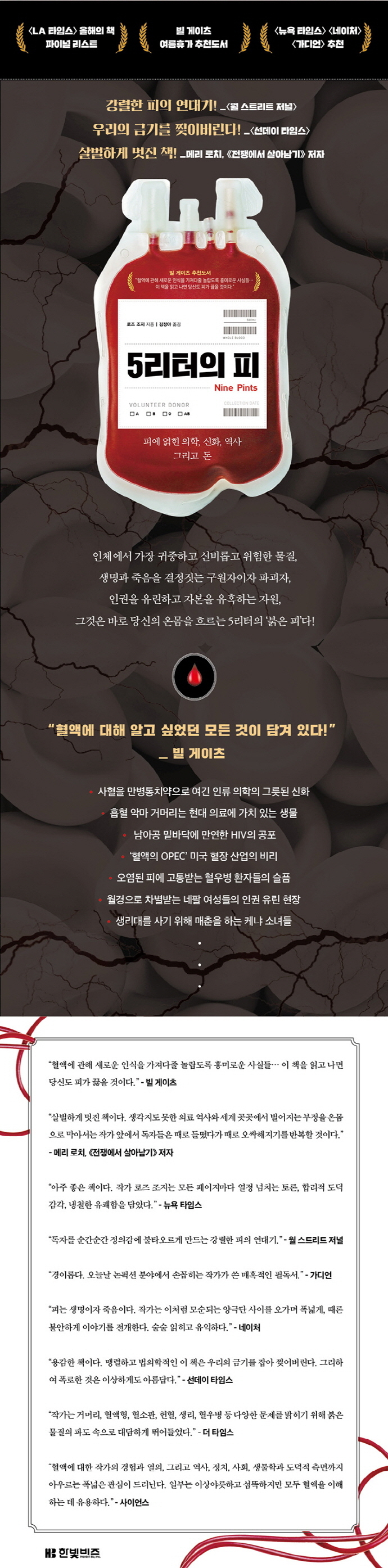 이외에도 아리아인의 순수 혈통에 사로잡혀 수많은 부상병을 사망에 이르게 한 나치 독일의 착오, 혈액형에 따라 인간의 성격을 구분한 일본의 관습 등 피의 그릇된 역사부터 피가 신체 어디에서 생성되는지, 우리가 헌혈한 피가 어떻게 보관, 처리, 유통되는지에 대한 상식에 이르기까지 작가 특유의 흡입력 넘치는 문체로 술술 풀어낸다. 그 덕분에 피가 인류의 역사에서 얼마나 위험하고도 신비로운 물질인지를 제대로 엿볼 수 있다.