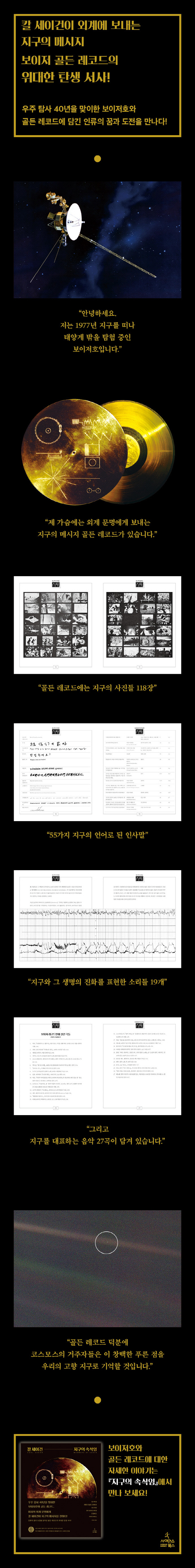 ‘여행자’라는 이름을 가진 두 우주 탐사선 보이저 1호와 2호는 지름이 약 30센티미터인 금박을 씌운 LP레코드판, 일명 ‘골든 레코드’가 붙어 있다. 이 레코드 판은 미래에 보이저호와 만날지 모를 미지의 외계 문명에게 보내는 지구와 인류의 메시지이다. 그 안에는 지구를 대표할 음악 27곡, 55개 언어로 된 인사말, 지구와 생명의 진화를 표현한 소리 19개, 지구 환경과 인류 문명을 보여주는 사진 118장이 수록되어 있다. 이 책에서 저자들이 수록될 콘텐츠를 두고 치열하게 고민하고 토론했던 뜨거운 현장을 생생하게 만나볼 수 있다. 또한 준비 과정에서 겪었던 웃지 못 할 해프닝들과 유쾌한 에피소드들이 감초처럼 등장해 재미를 더한다.