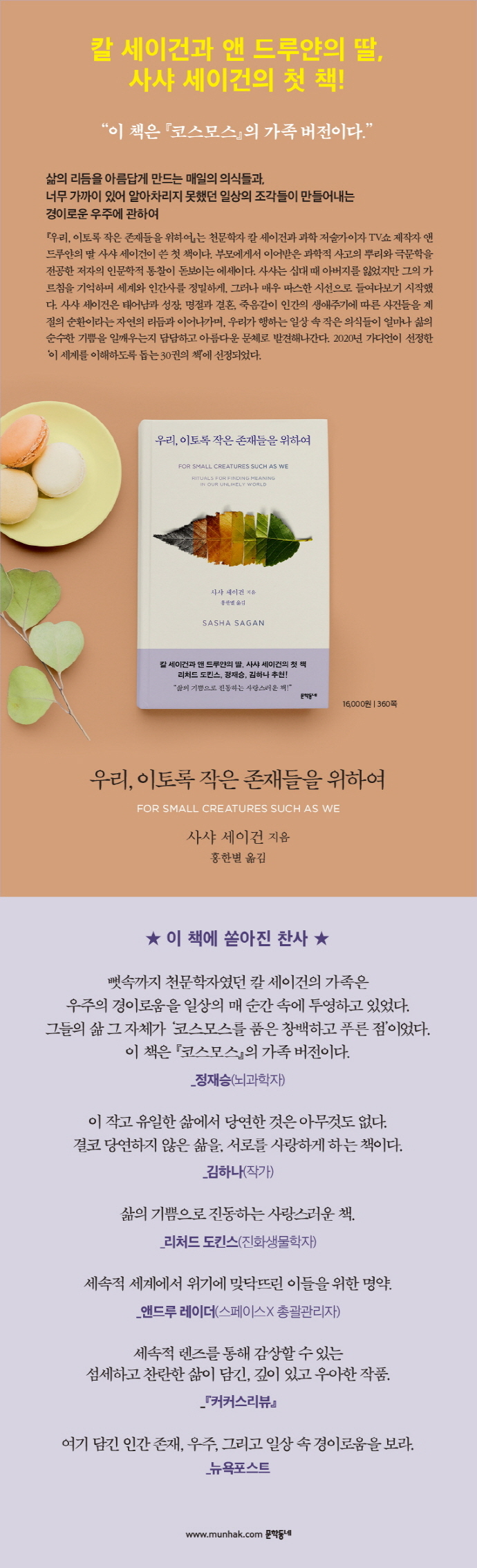 삶의 리듬을 아름답게 만드는 매일의 의식儀式들과, 너무 가까이 있어 알아차리지 못했던 일상의 조각들이 만들어내는 경이로운 우주에 관하여. 『우리, 이토록 작은 존재들을 위하여』는 천문학자 칼 세이건과 과학 저술가이자 TV쇼 제작자 앤 드루얀의 딸 사샤 세이건이 쓴 첫 책이다. 출간 전부터 화제를 모았으며 2020년 가디언이 선정한 ‘이 세계를 이해하도록 돕는 30권의 책’에 선정되었다.