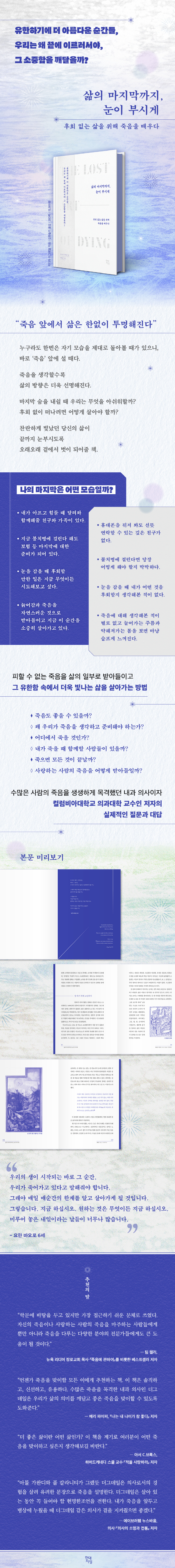 이 책은 솔직하고, 신선하고, 유용하다. 수많은 죽음을 목격한 내과 의사인 더그데일은 우리가 삶의 의미를 깨닫고 좋은 죽음을 맞이할 수 있도록 도와준다.